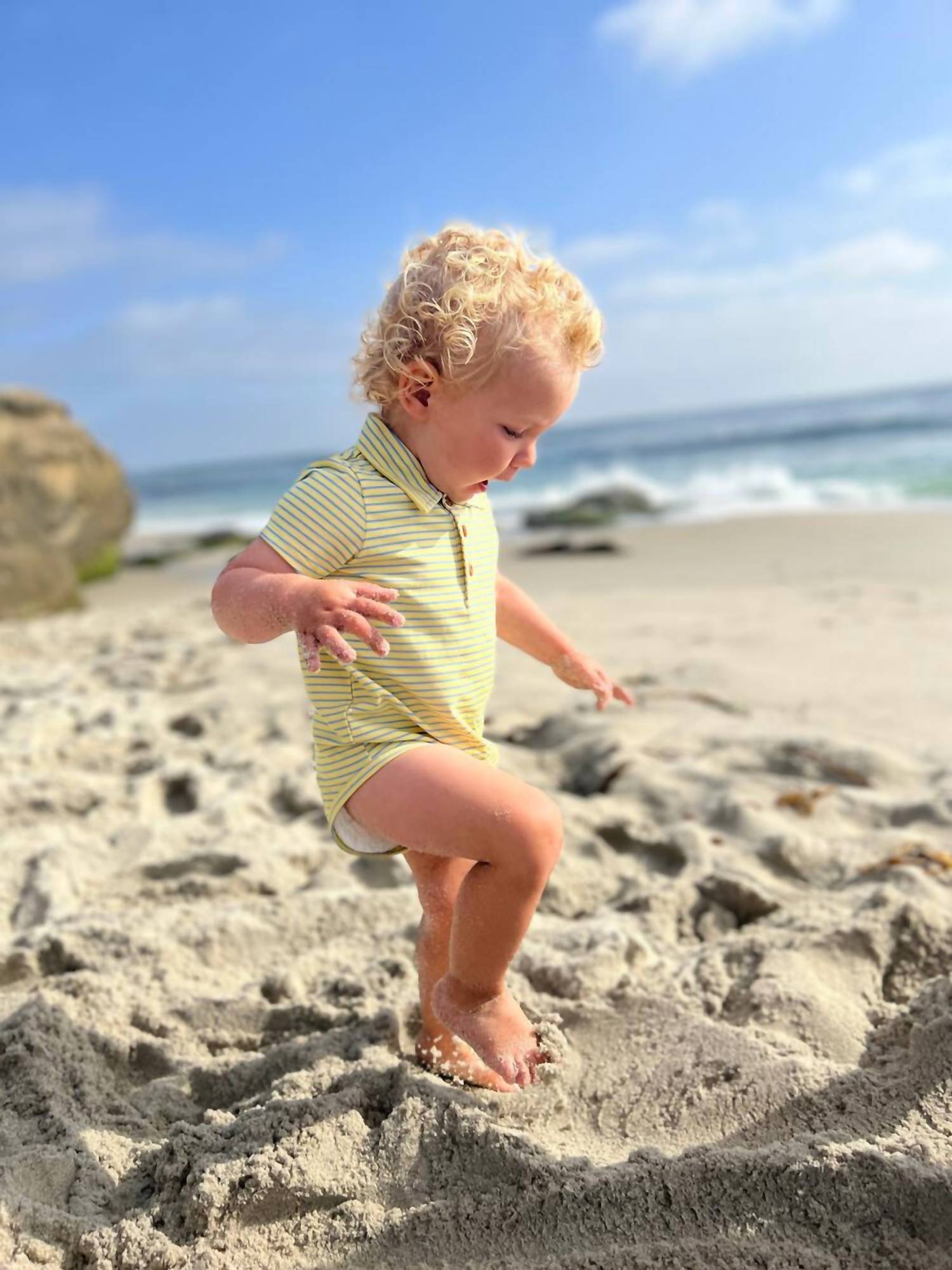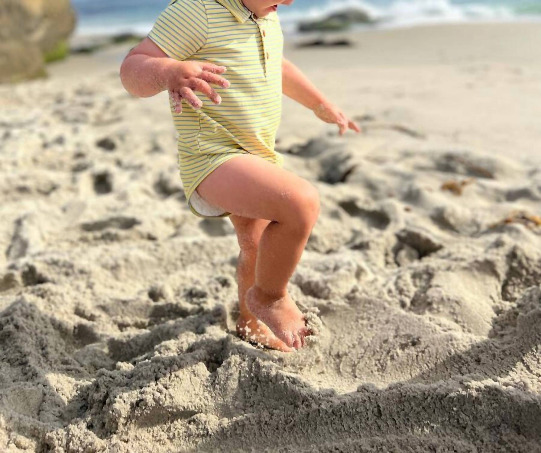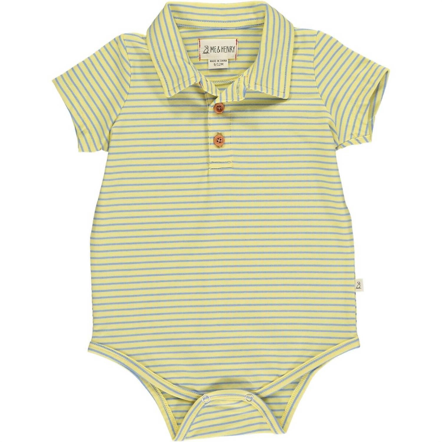 100% Cotton. Classic polo design. Buttoned closure neck with collar. Short sleeves. Striped. Snap bottom for easy diaper changes.