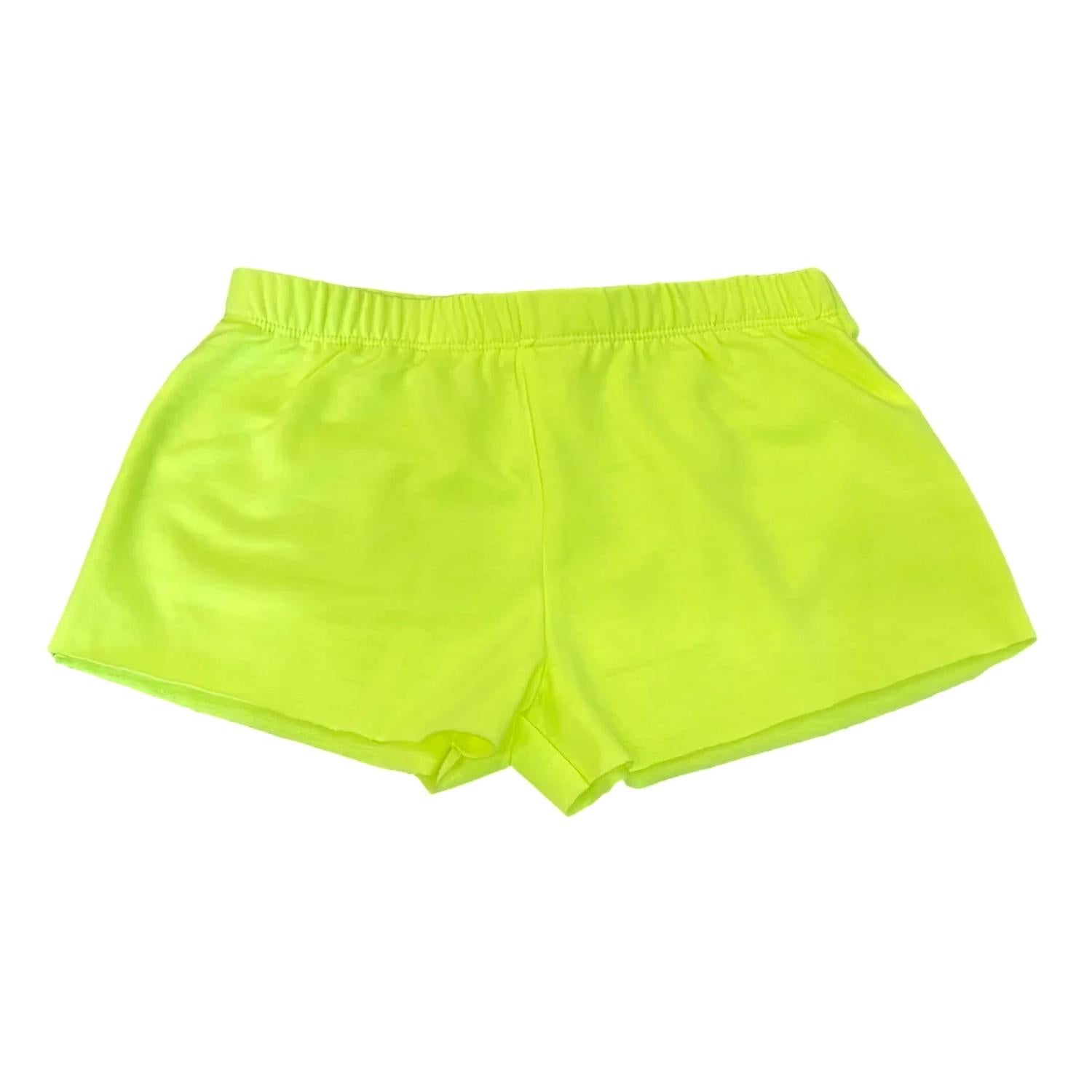 The Tweenstyle Girls Fleece Shorts in vibrant Neon Yellow offer comfort and style with their soft fleece material. Expertly crafted in the USA, these shorts feature a covered elastic waistband for ease and flexibility. They are perfect for pairing with any tee or the matching neon sweatshirt, making them suitable for year-round wear.