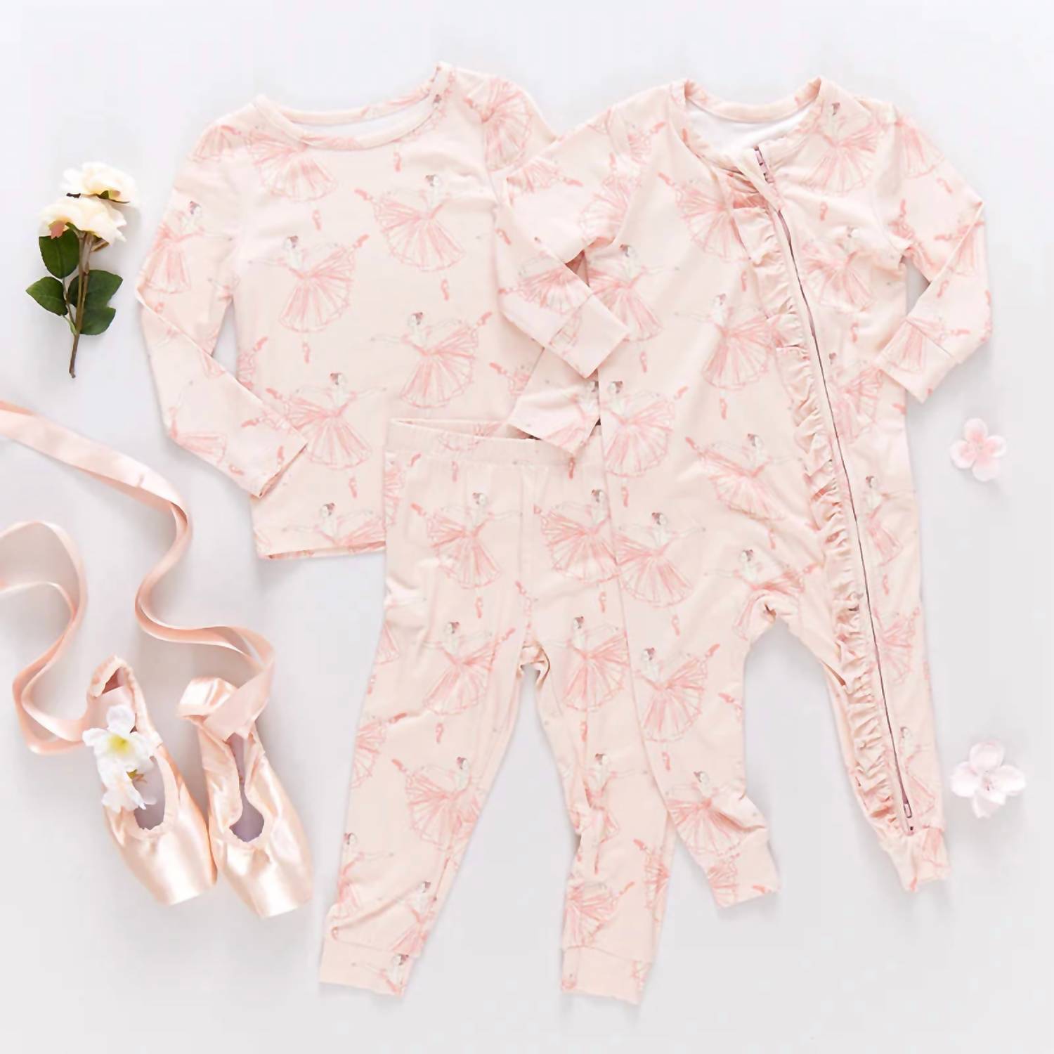 The Kids Bamboo PJ Set by PINK CHICKEN in Pink Ballerinas is a delightful choice for your child's bedtime comfort. This set features a long-sleeve top paired with elastic waist pants, offering a snug fit perfect for playful nights or cozy slumber. Crafted from silky soft bamboo fabric, it ensures all-season comfort with its breathable and thermo-regulating properties, tailored to keep kids cool in summer and warm during winter. Ideal for both sleeping and lounging, this pajama set is as versatile as it is stylish, making bedtime truly special.
