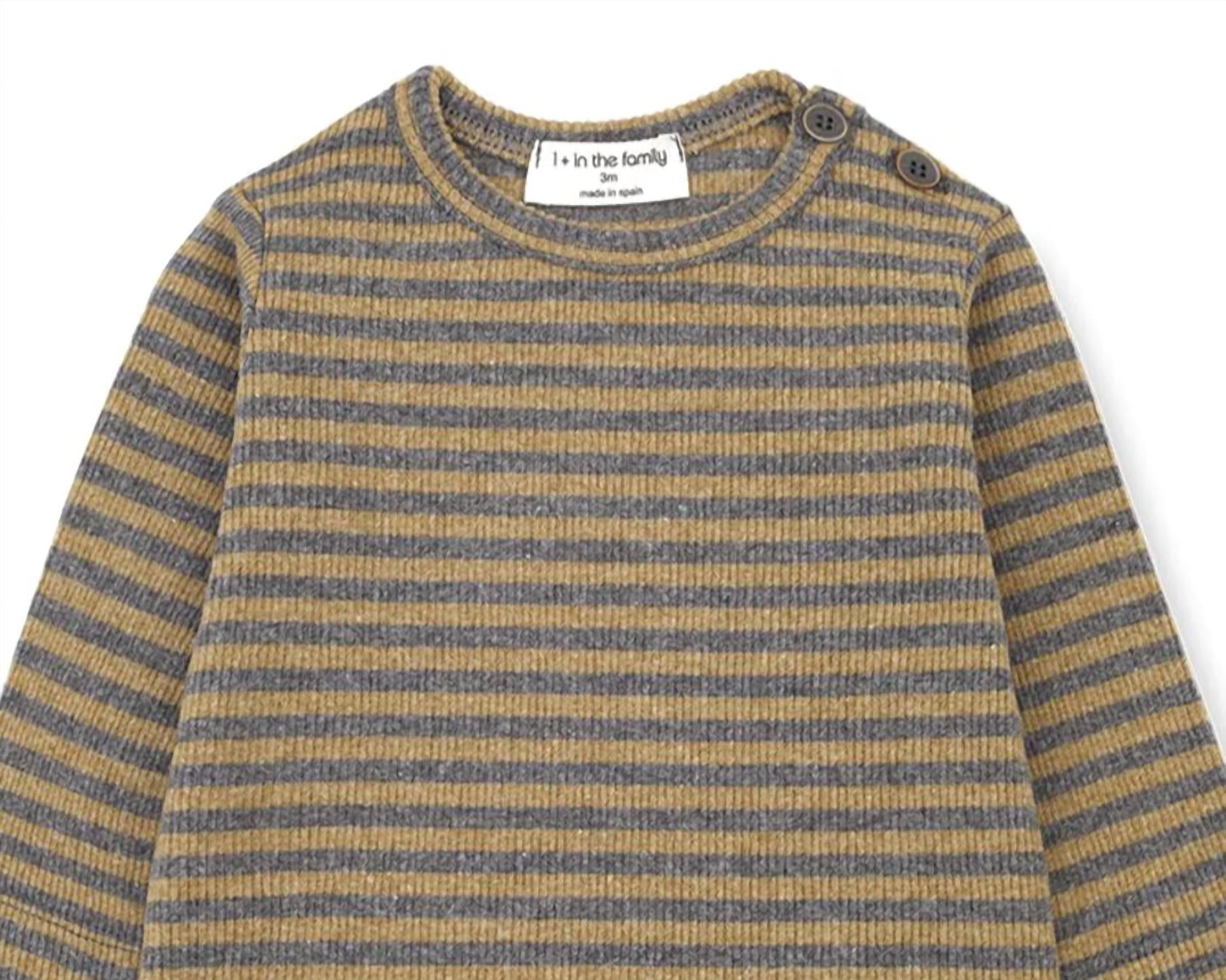 Dress your little one in the Boy Magali T-shirt by One More In the Family, crafted from a soft cotton blend for supreme comfort. This long sleeve T-shirt in a charming ochre hue features eye-catching stripes and unique shoulder buttons. It's designed and made in Spain, ensuring quality and style. Ideal for boys, this piece adds a playful yet chic touch to any toddler's wardrobe.