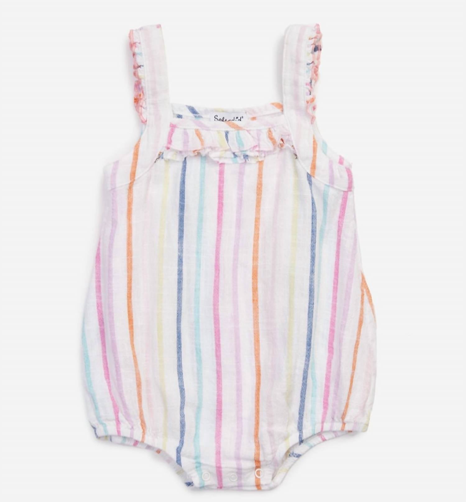 Introducing the Venice Beach Stripe Onesie by Splendid, a delightful piece tailored for sunny days. This girls' onesie features a charming ruffled neckline and a convenient snap bottom for effortless diaper changes. Crafted from a breathable linen blend, it showcases a classic beach stripe pattern. Care: Machine wash.