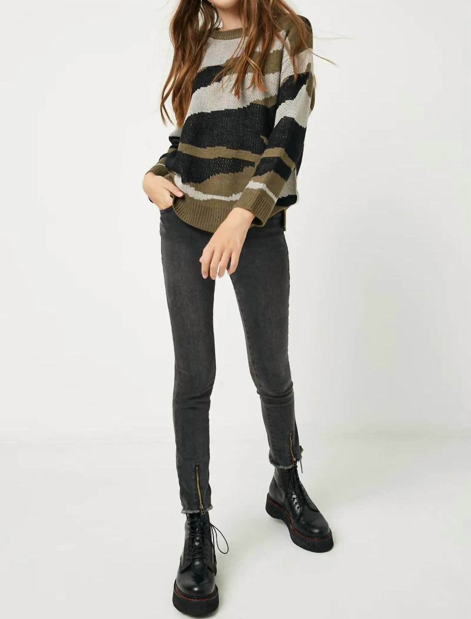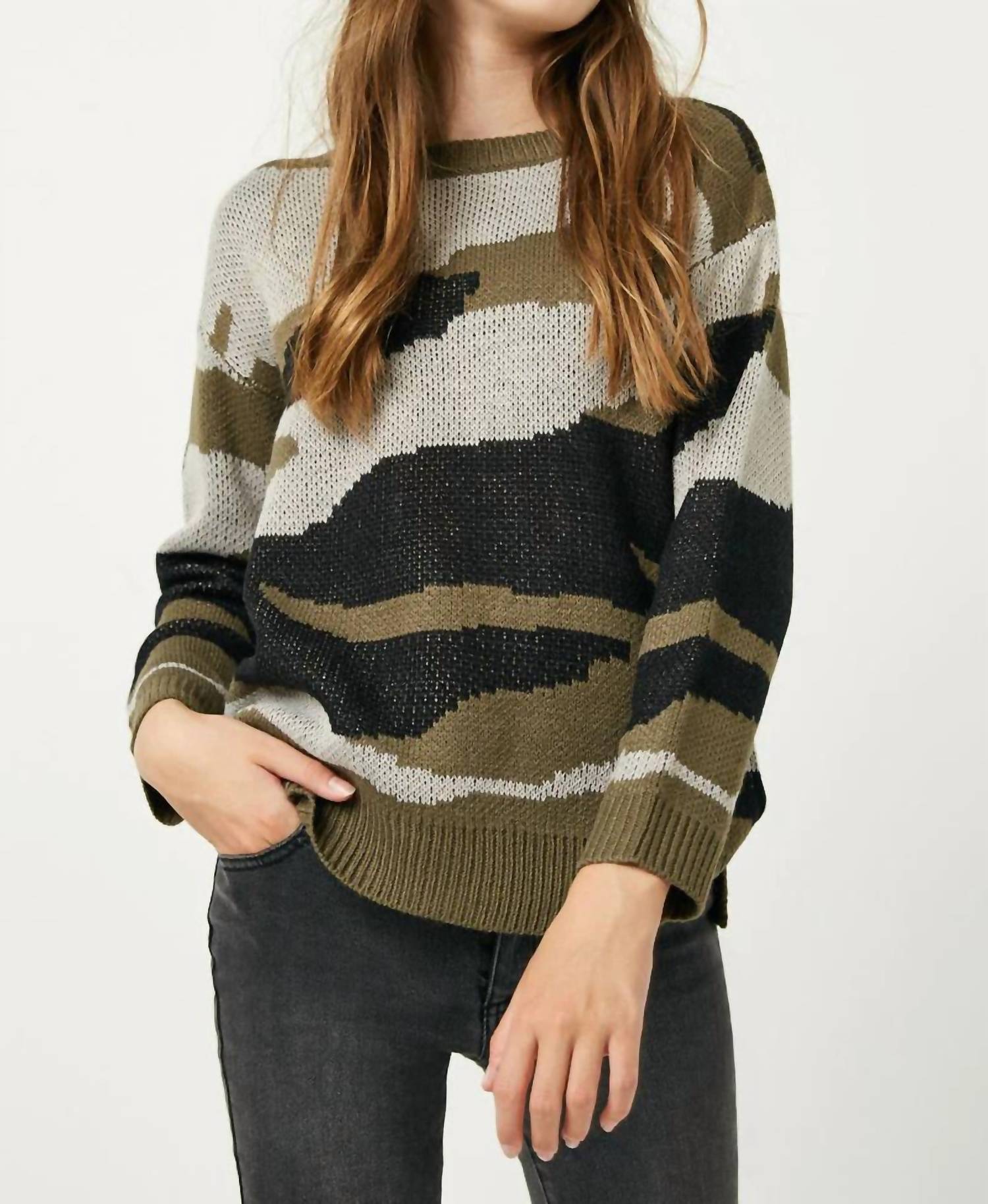 This pull-on camo piece features a sophisticated camouflage pattern and ribbed cuff sleeves with dual slit hemlines for additional flair. Crafted entirely from 100% acrylic, it's designed for both comfort and fashion. Care for it with ease: simply machine wash and line dry.