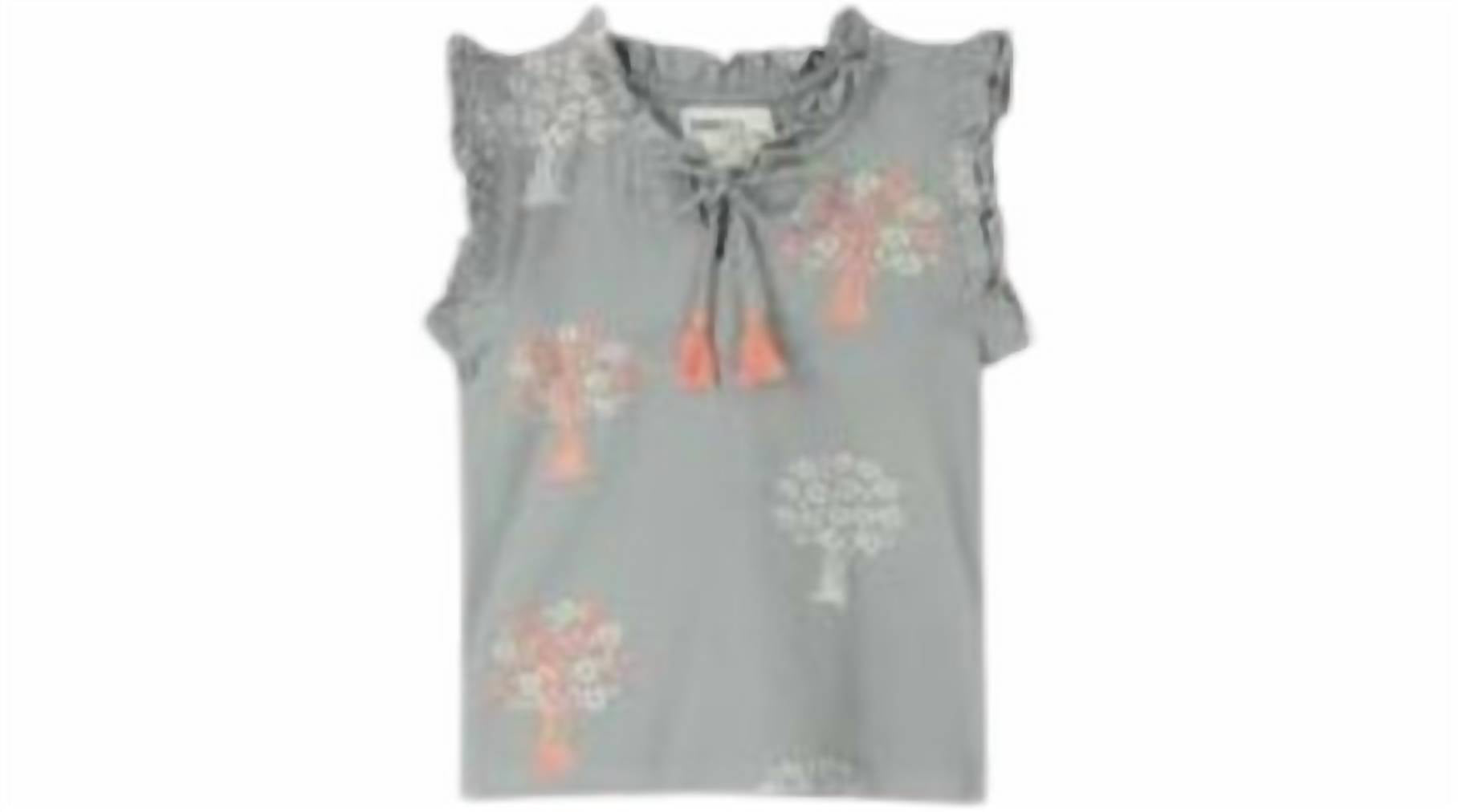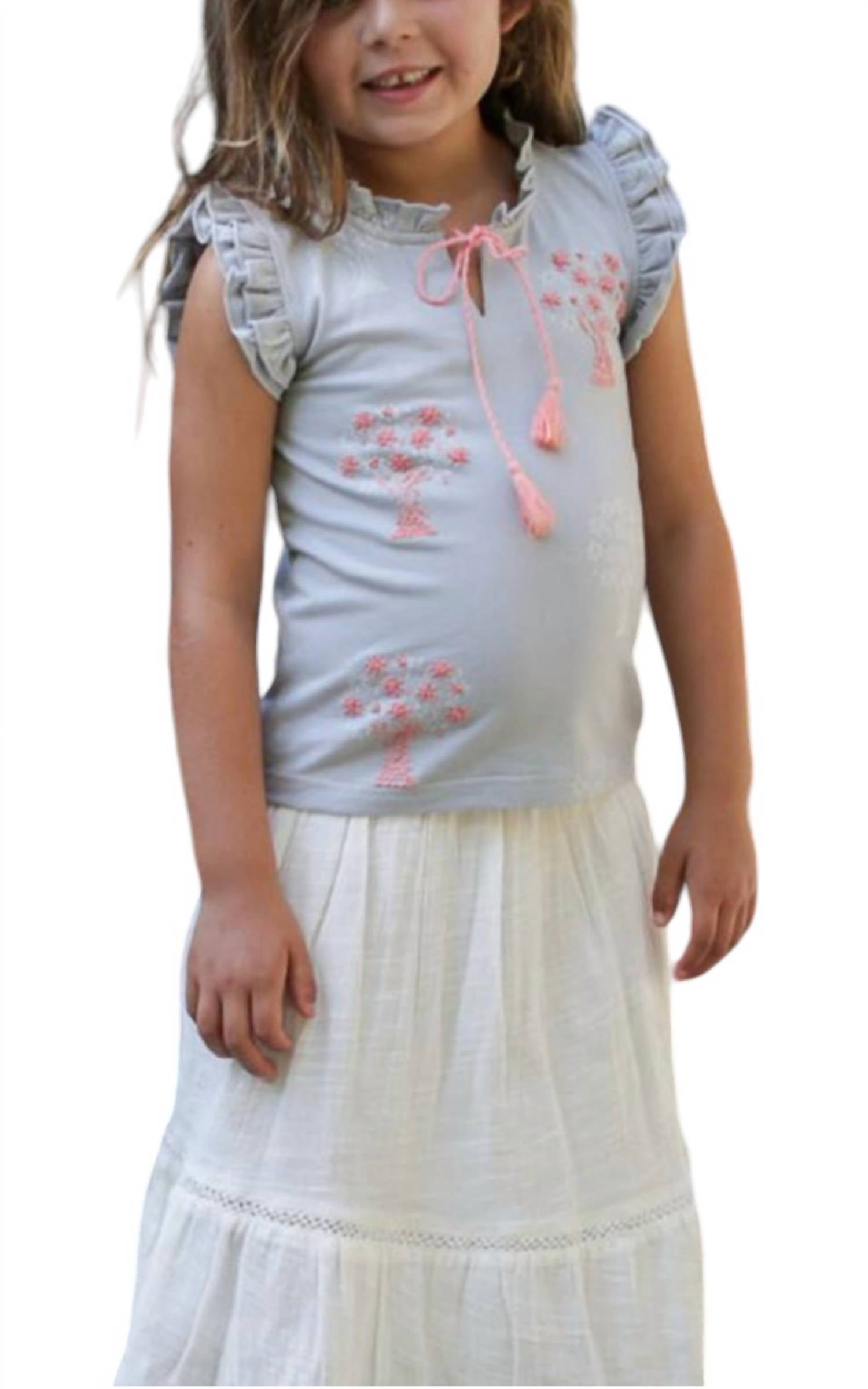 Celebrate playful elegance with the Sakura Jersey Embroidered Ruffle Collar & Cap Sleeve Girls Top by POPPET & FOX. Made from soft, breathable cotton in grey, this blouse features a charming embroidered ruffle collar and cap sleeves for a breezy, stylish look. Perfect for casual outings and special occasions, it blends everyday comfort with a vintage flair.