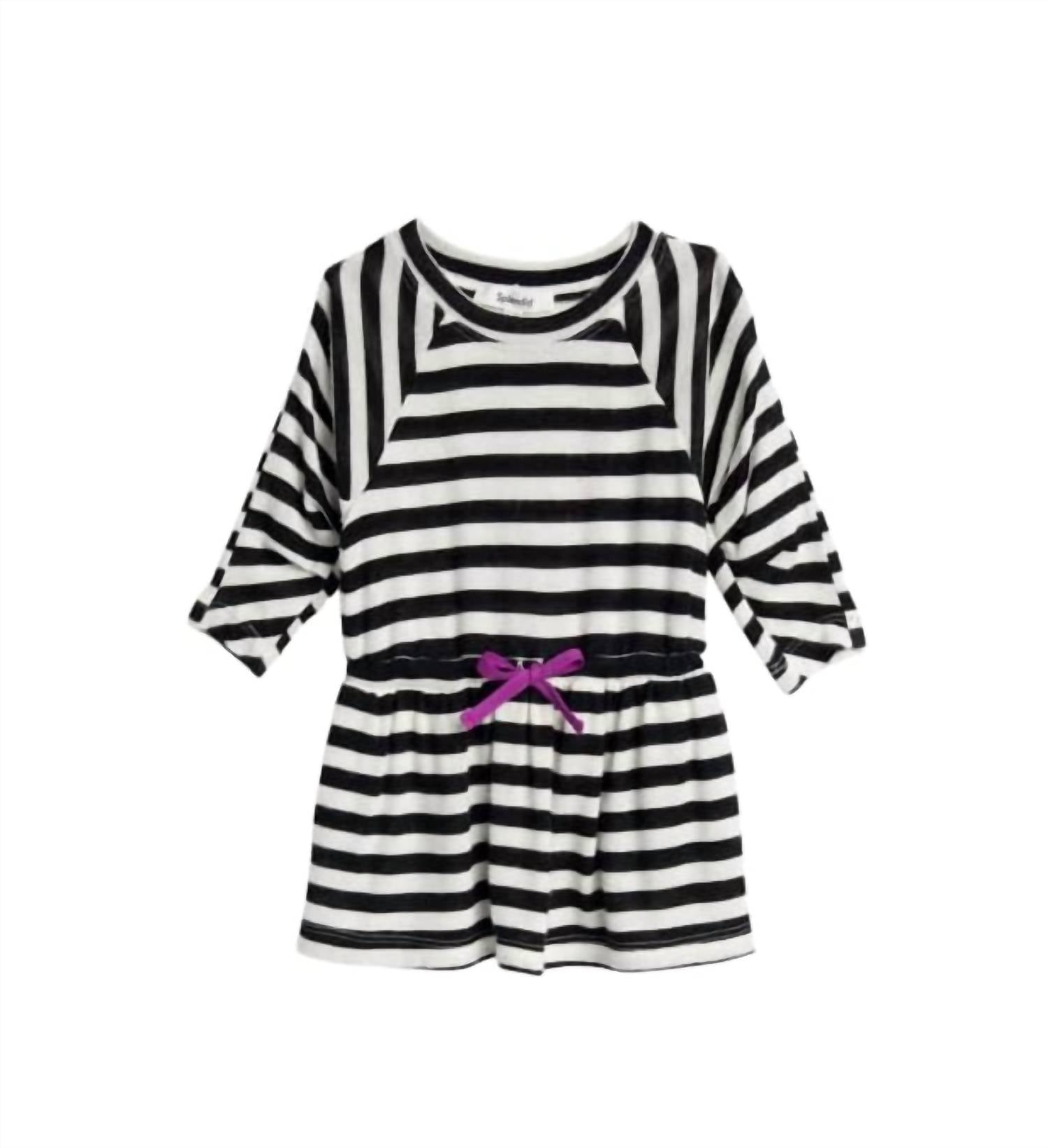 A stylish blend of casual and cute with its black and white striped design. Featuring long raglan sleeves, it's perfect for comfort and style, while a colorful herringbone ribbon bow at the waist adds a delightful touch. With its crew neck and striking pattern, this dress is an ideal choice for a unique wardrobe staple.