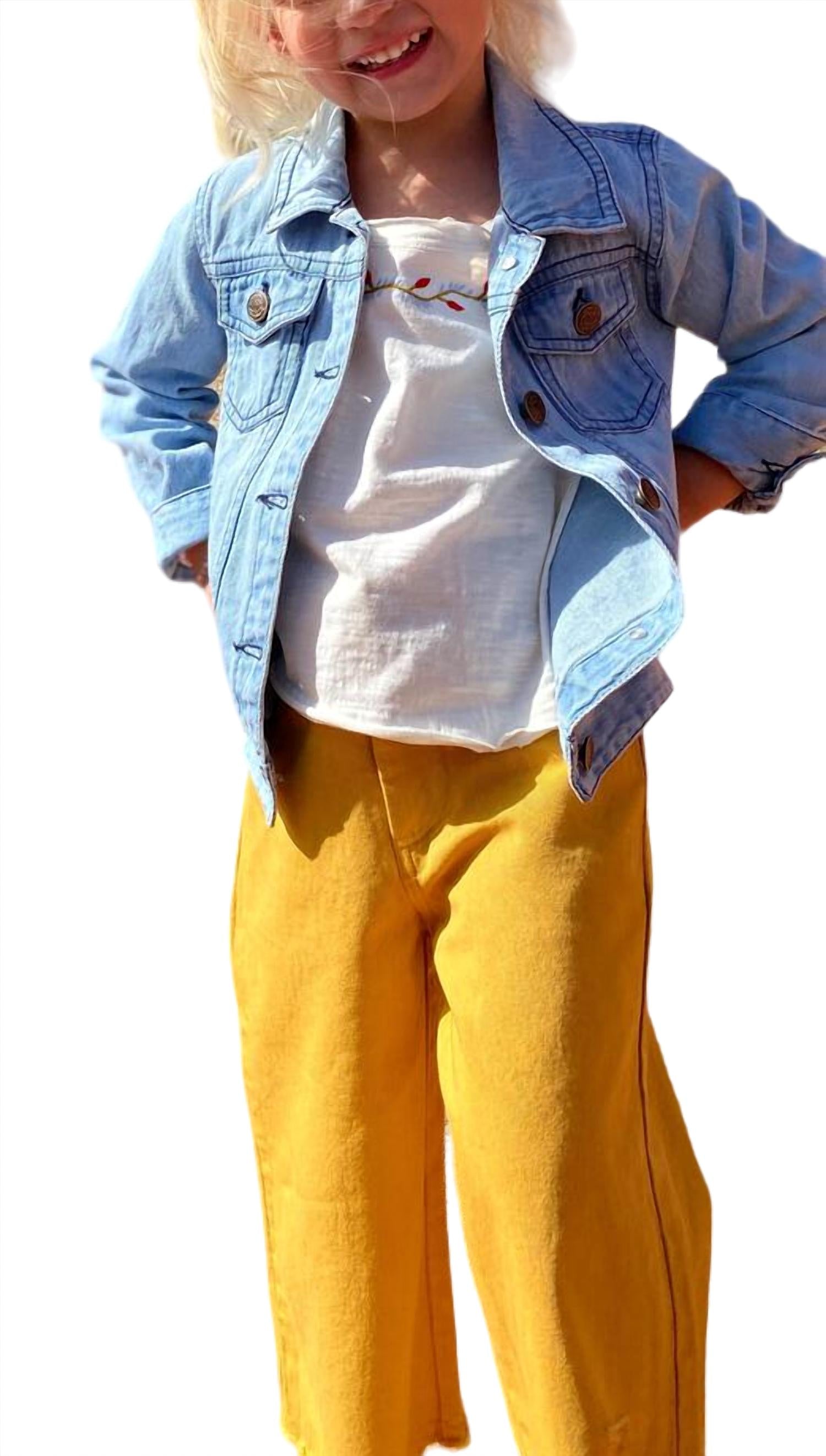 Perfect for any occasion, the yellow pants add a pop of color! Whether she's playing in the park or attending a family gathering, she'll be the center of attention in this trendy ensemble. Comfortable and fashionable, this outfit is a must-have for any fashion-forward little girl. 100% Cotton.