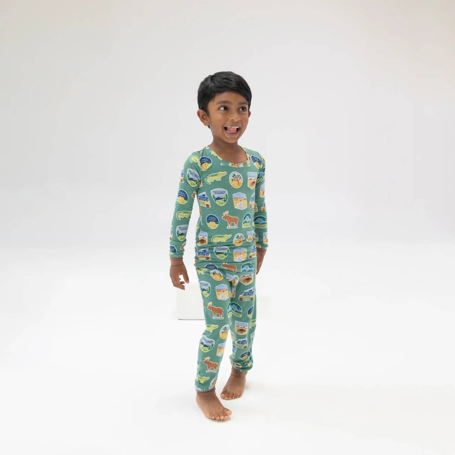 Introducing the Boy's Loungewear Set by ANGEL DEAR, a perfect blend of comfort and style for your little one's relaxation time. This set, crafted from a 95% viscose from bamboo and 5% spandex blend, showcases a playful National Park Sticker pattern. Designed for easy care, it is machine washable on a gentle cycle and can be tumble dried on low. Ideal for spring vacations and Thanksgiving gatherings, this athleisure-inspired set is a must-have for lounging in style.