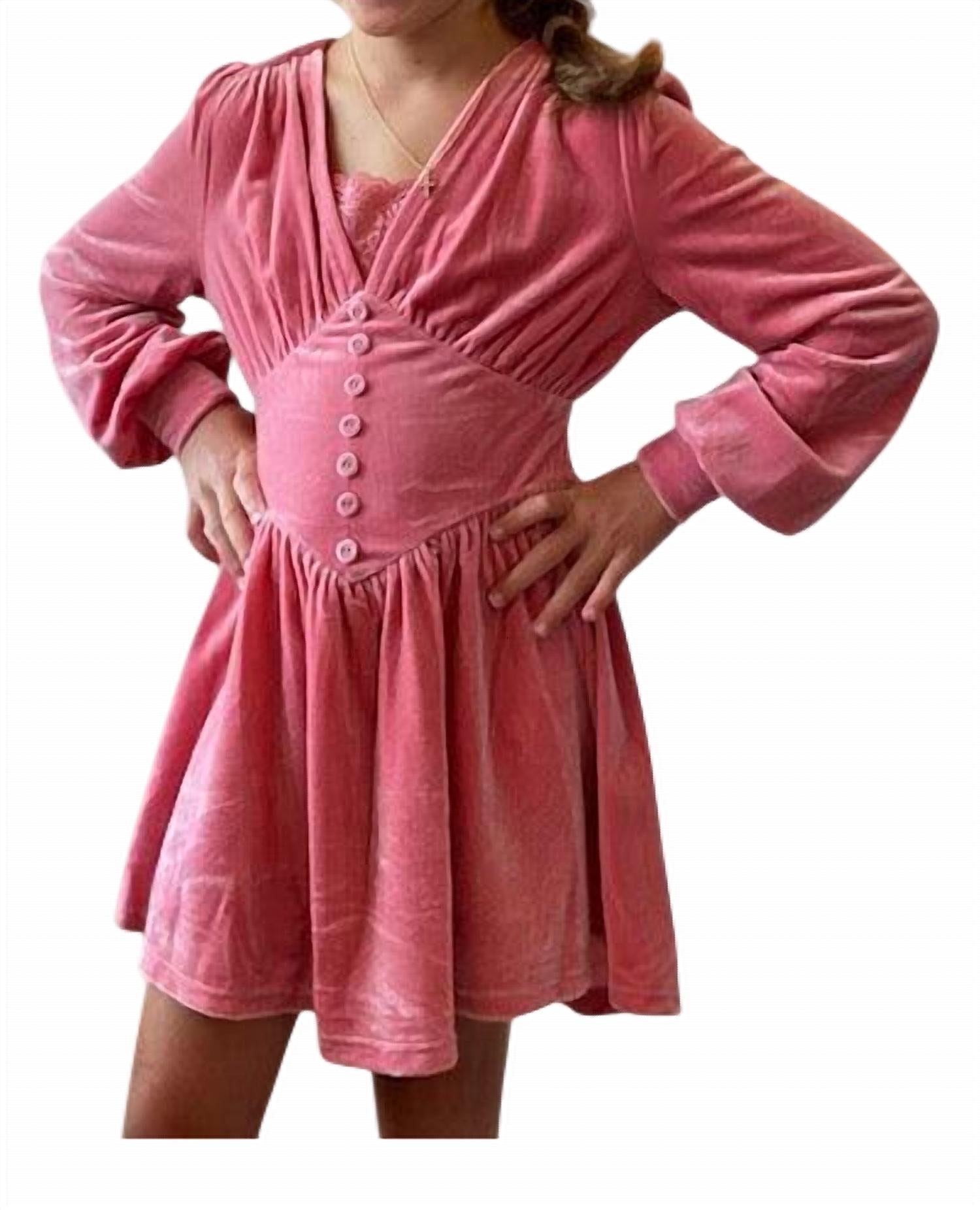 The Katie J NYC Kids Velvet Dress in charming pink is a delightful addition to any young girl's casual wardrobe. This long sleeve dress features exquisite lace detailing on the neckline, a corset-style waist, and a playful ruffle skirt. It is crafted from plush velvet material and designed with a convenient zipper closure at the back. Perfect for making every occasion special.