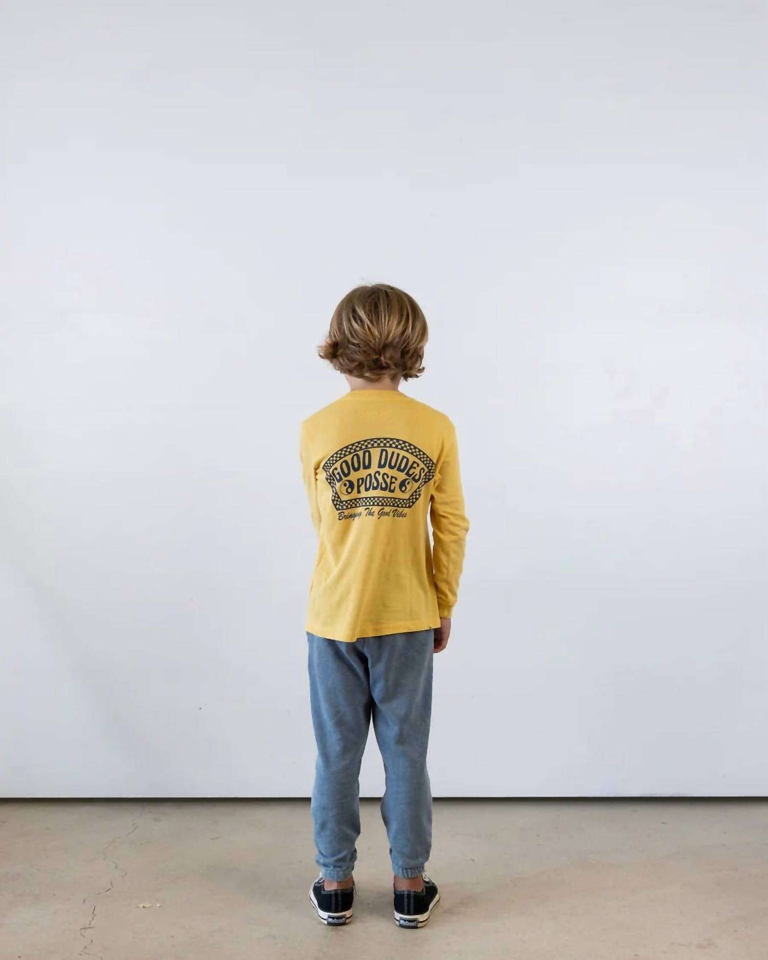 This long sleeve tee, crafted from 100% Cotton jersey, features a vibrant graphic in a muted mustard color, printed using non-toxic water-based ink for a safe and soft feel. Machine washable for easy care.