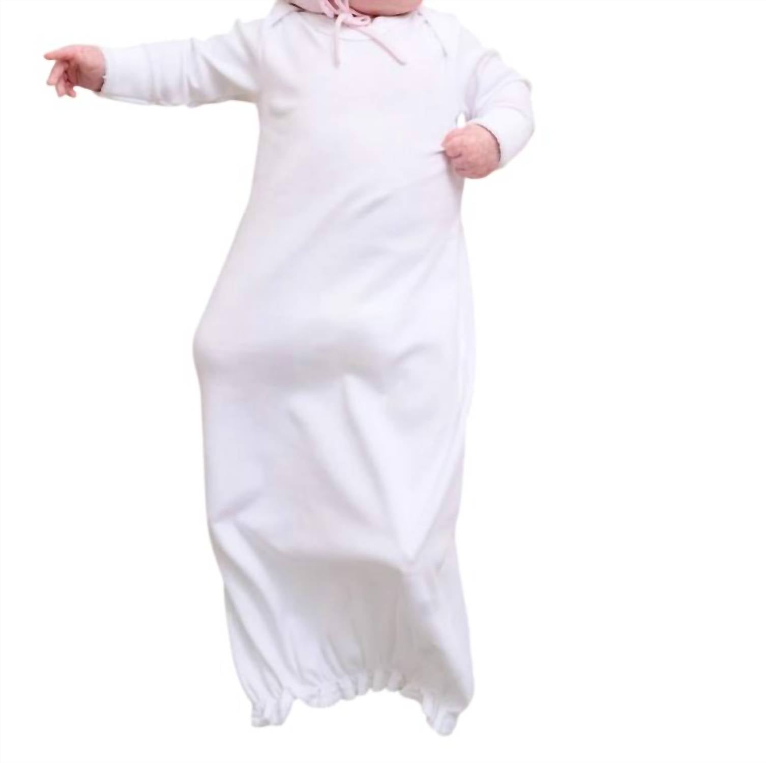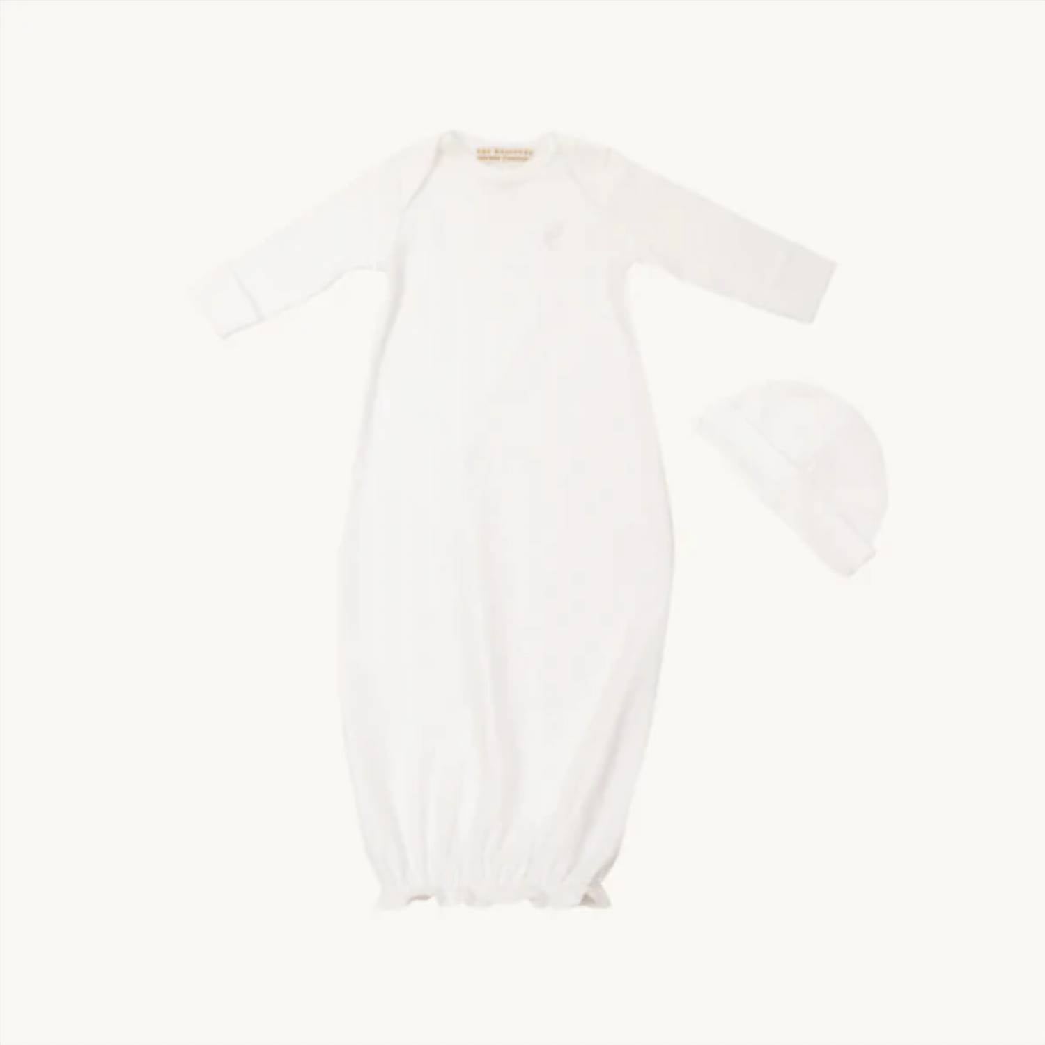 This newborn gift set is suitable for baby boys or girls and made from 100% Worth Avenue White Peruvian Pima Cotton. It fits size 0/3 months and includes a hat. The gown has an elastic bottom for easy diaper changes and features an embroidered stork on the bottom left. The set is soft on the baby's skin and approved by Sir Proper the Stork. To care for it, machine wash in cold water with like colors on a gentle cycle, turn inside out, and lay flat or tumble dry on low.