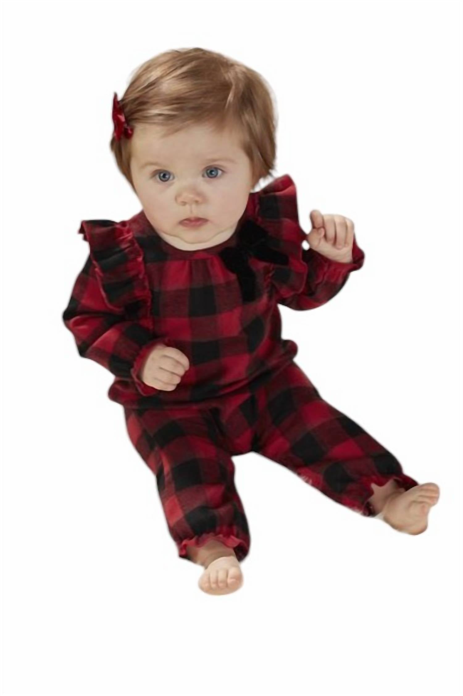 Introducing the Baby Buffalo Check Flannel One-Piece by Mudpie, designed for stylish comfort for your little girl. This adorable piece is crafted with a soft blend of 64% Polyester, 29% Cotton, and 7% Rayon, featuring a charming plaid and check pattern. Its flannel material ensures warmth and coziness, perfect for chilly days. Color: Red. Style: Footies. Origin: Not specified.