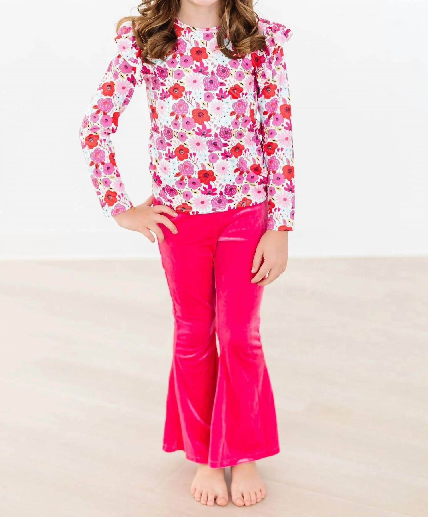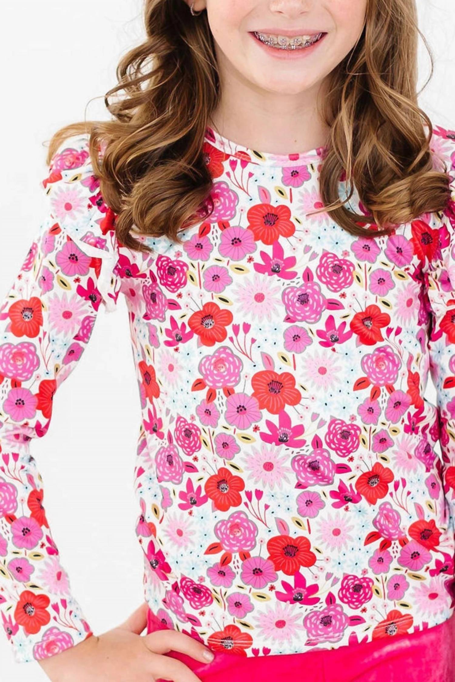 Delight in the charm of the Girls Long Sleeve Ruffle Tee by Mila & Rose, featuring a whimsical "Secret Garden" print. This polyester and spandex blend top stands out with its easy-to-style nature, perfect for pairing with skirts, leggings, or jeans. Effortlessly versatile, it layers beautifully under any jacket or coat. Care for this delicate piece with a simple machine wash to keep it looking fresh and vibrant.