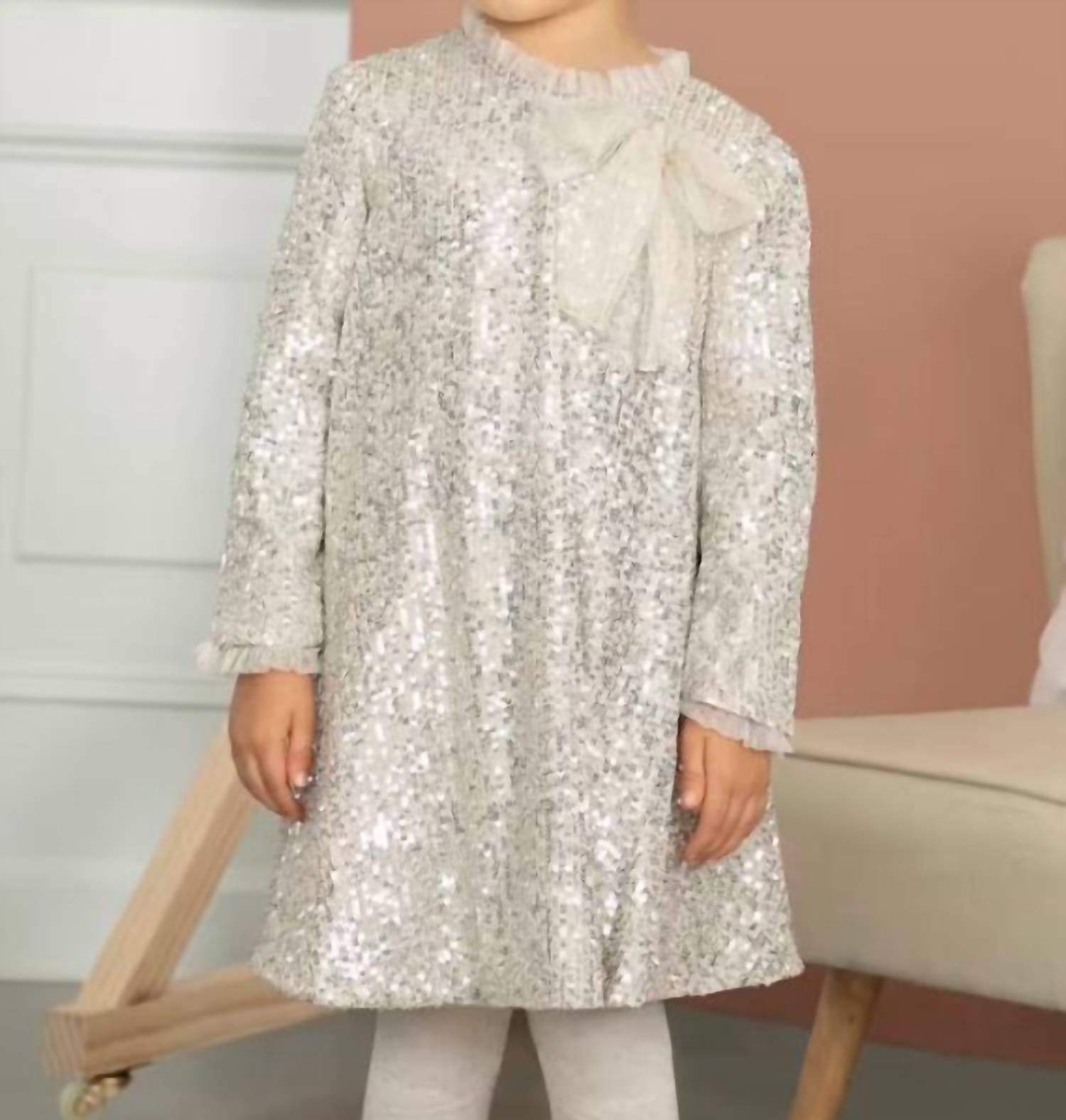 The Kid's Sequin Mini Dress by Abel & Lula is the perfect choice for any holiday or special occasion, available in a captivating silver and gold colorway. Crafted from a blend of 93% Polyester, 5% Elastane, and 2% Polyamide, it ensures comfort while delivering a sparkling effect for any event. Ideal for casual wear, this patterned dress boasts a luxurious feel that aligns with the Quiet Luxury trend. Care is easy, with instructions to machine wash and lay flat to dry.