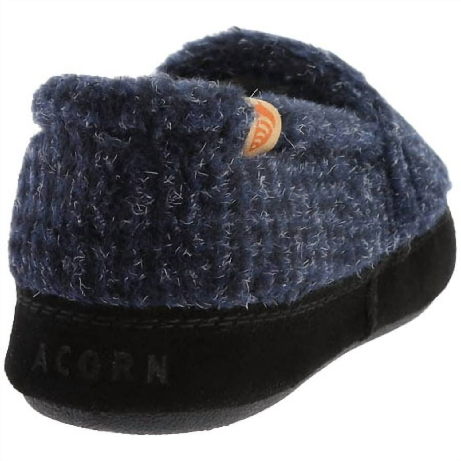 Experience comfort with the Kid's Moccasin Slipper by Acorn, designed for active boys. Featuring a round toe and flat heel, these blue slippers ensure cozy wear with moisture-wicking linings and a suede sidewall for enhanced durability. The premium Cloud Cushion™ footbed offers a multilayer support, complemented by a skid-resistant outsole suitable for both indoor and outdoor activities. Care: Machine wash cold; air dry. Ideal for springtime vacations, these minimalist slippers embody both practicality and style.