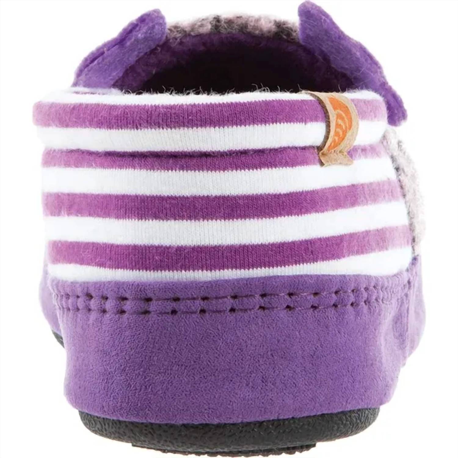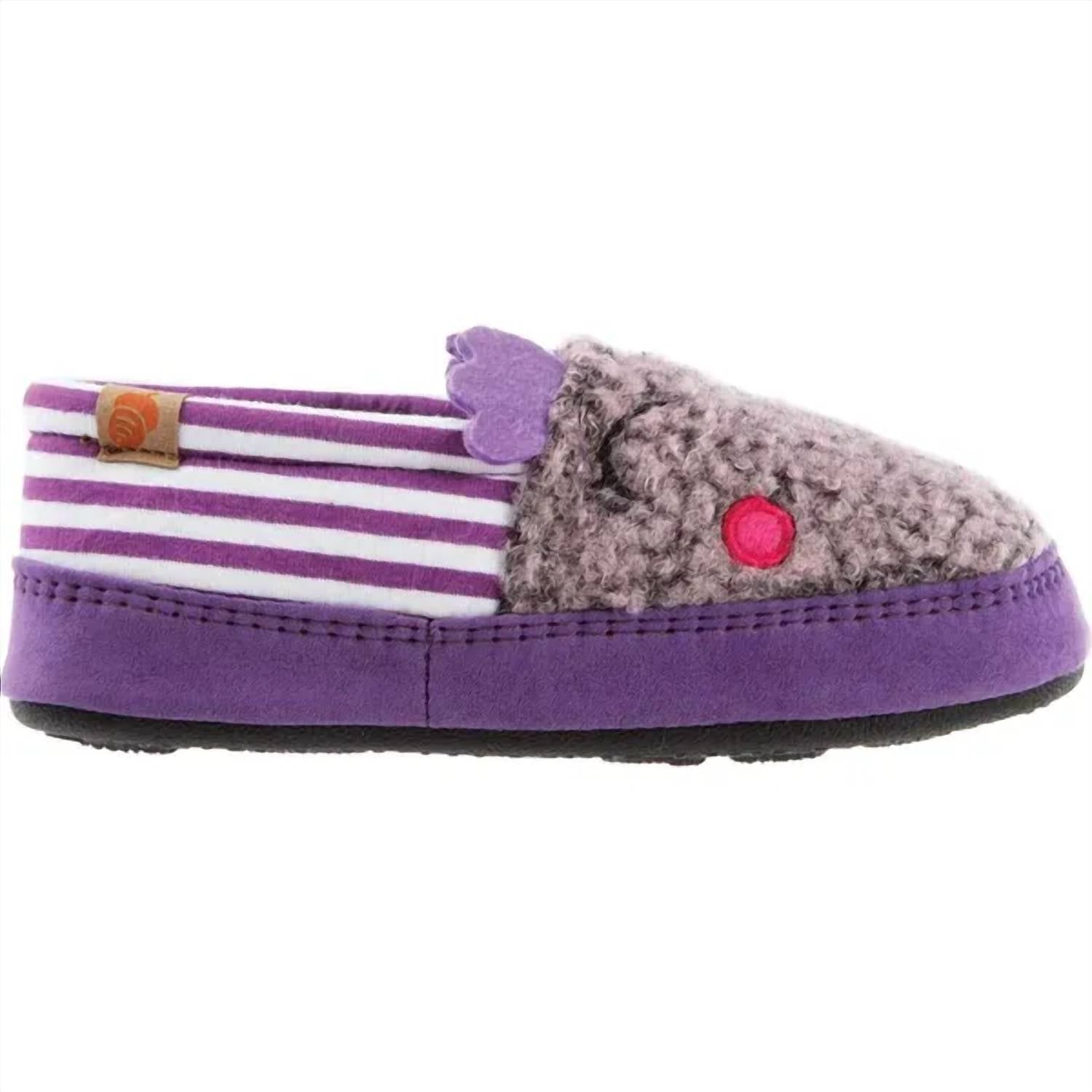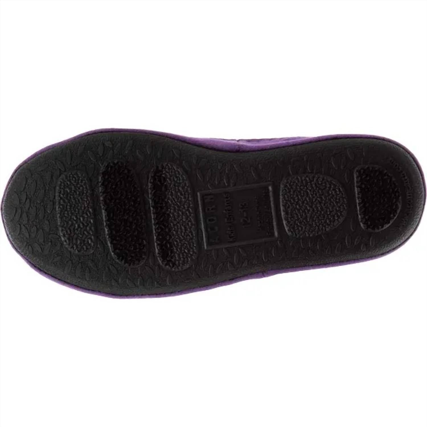 The Acorn Kids Critter Novelty Moc Slippers in Iris offer a delightful blend of whimsy and comfort for young girls. Crafted from cozy fleece, these slippers feature a round toe and flat heel designed for all-day ease. With a critter-inspired design and moisture-wicking fleece lining, they ensure a playful yet practical wear. The slip-resistant indoor/outdoor outsole provides versatility and stability for little ones on the move.