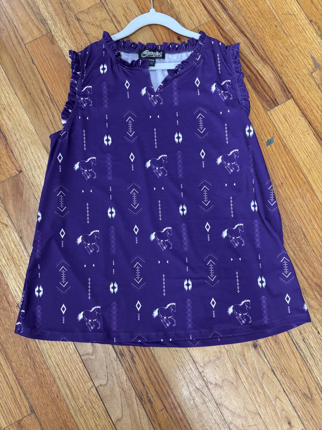 Meet the Girls Horse Eggplant Aztec Ruffle Trim Tank Top by Cowgirl Hardware, perfect for those seeking a fresh spring vacation wardrobe. This patterned tank top showcases a vibrant eggplant hue with Aztec designs and ruffle trim for a playful touch. Made from durable polyester, it promises lasting comfort and style. Ideal for embracing the maximalist trend, this women's top effortlessly blends fashion with adventure.