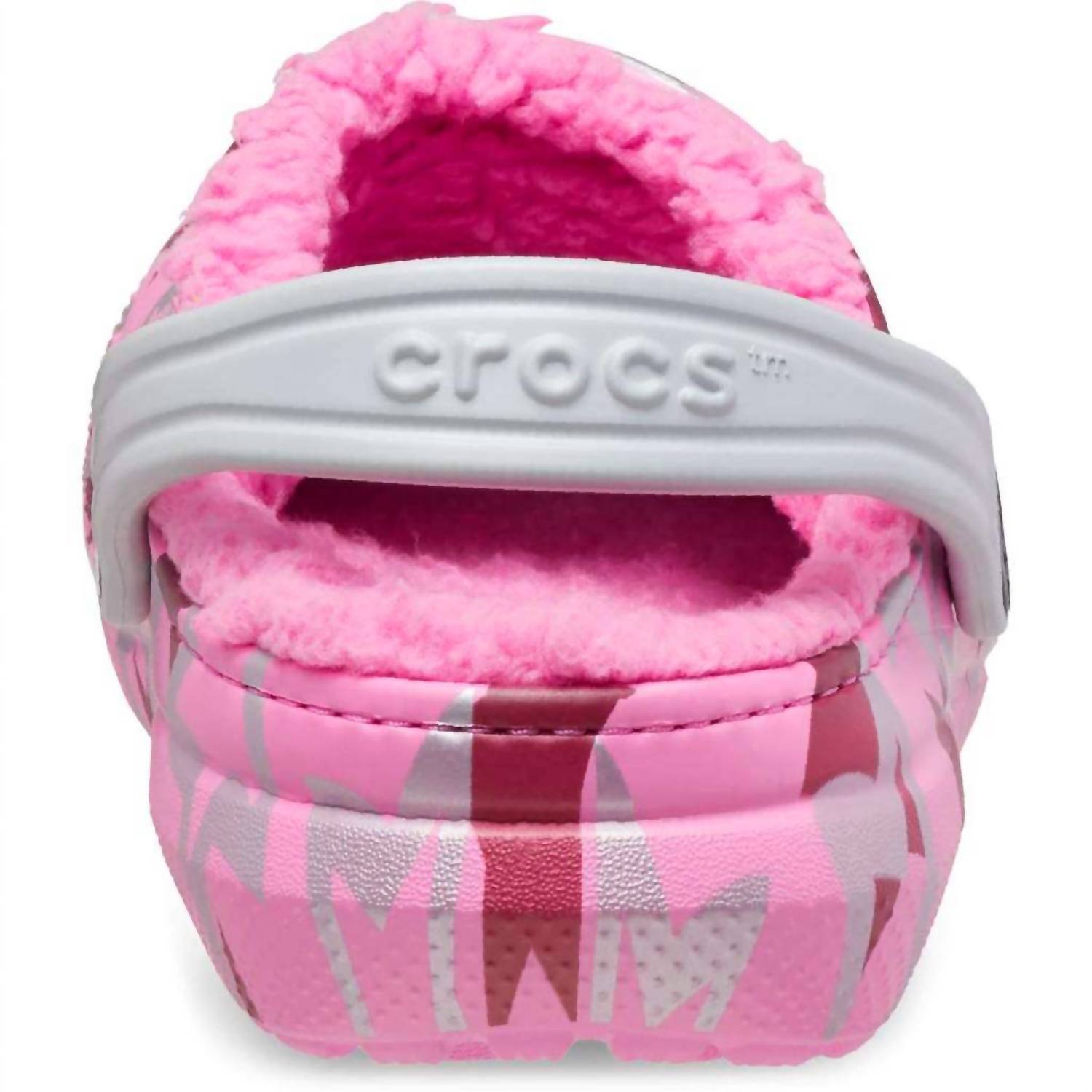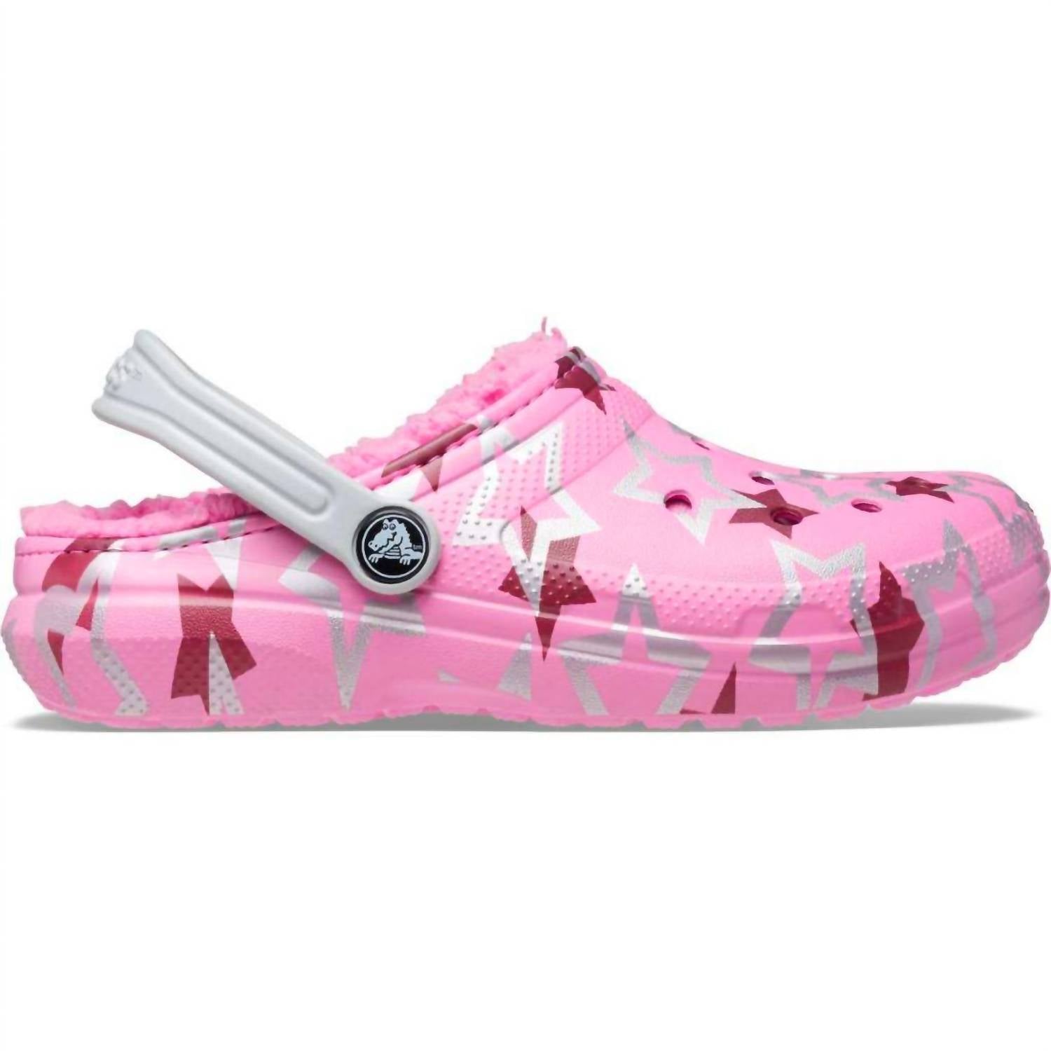 Meet the Kids' Classic Lined Disco Dance Party Clog by Crocs, designed to deliver unmatched comfort and style in Taffy Pink Multi. Featuring a warm, soft fleece lining and a dazzling glittering star print, these clogs are perfect for both indoor and outdoor adventures. The adjustable heel strap ensures a secure fit, while the lightweight Crosliteâ„¢ foam construction adds to their easy wearability.