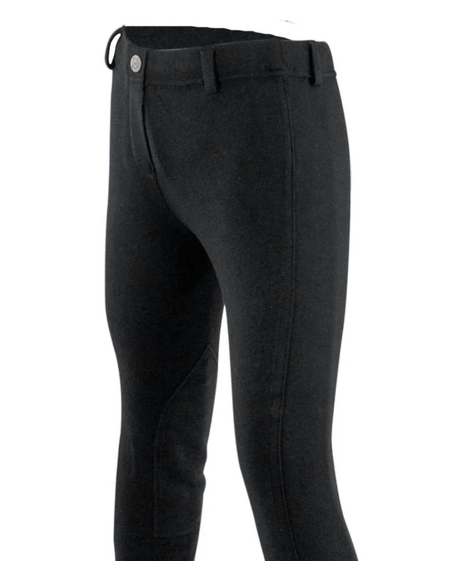 Introducing the EquiStar Kids Pull-on Knee Patch Breech Pants in classic black, perfect for stylish young equestrians. These jeans feature a comfortable medium mid-weight cotton/lycra blend with a pull-on design, ensuring ease of wear with no front zip or constricting waistband. They offer a medium-low rise waist and washable knee patches for added durability, complete with hook and loop quick adjusting bottoms. Care is simple with machine wash instructions, making these breech pants a practical choice for the summer season.