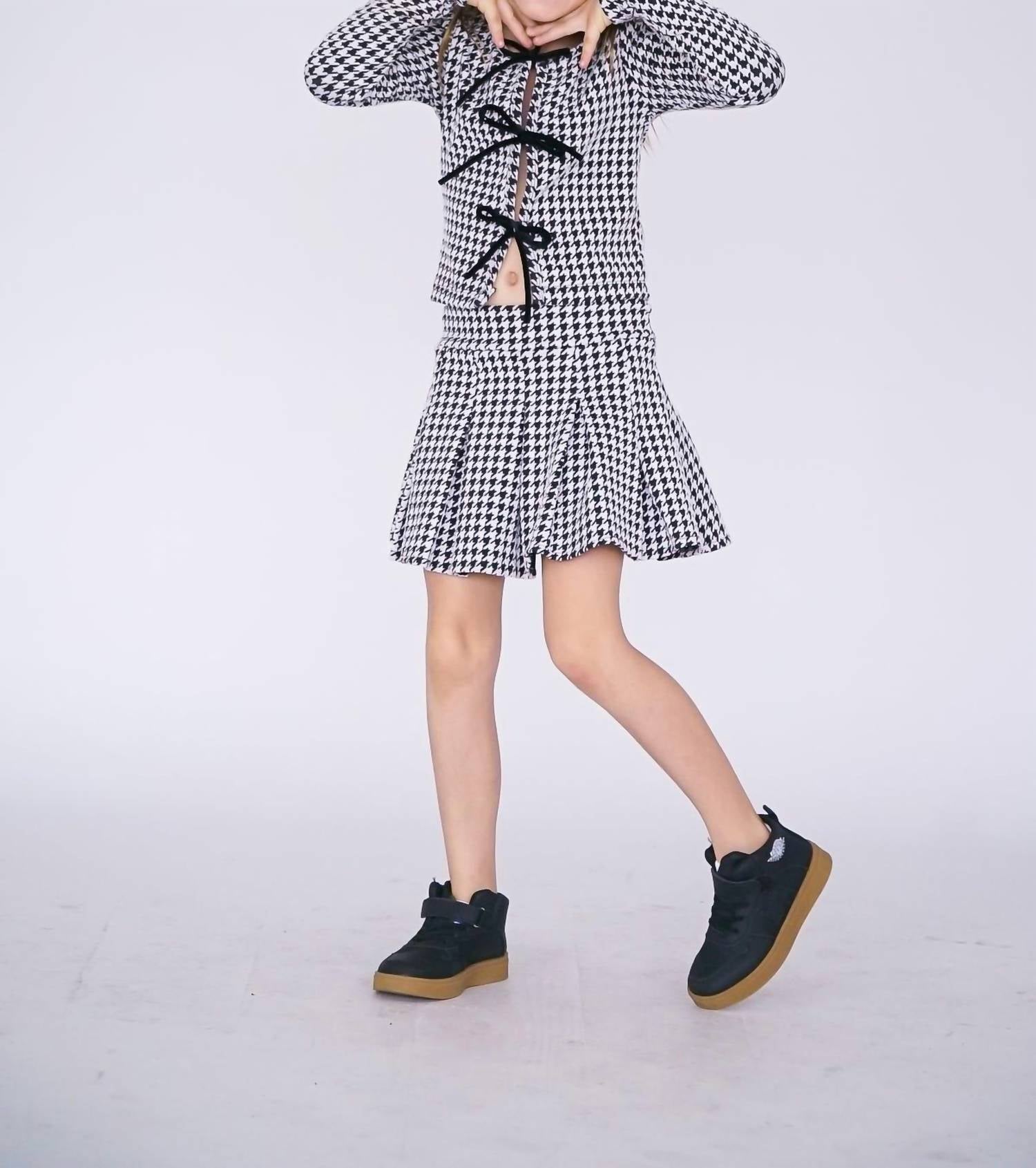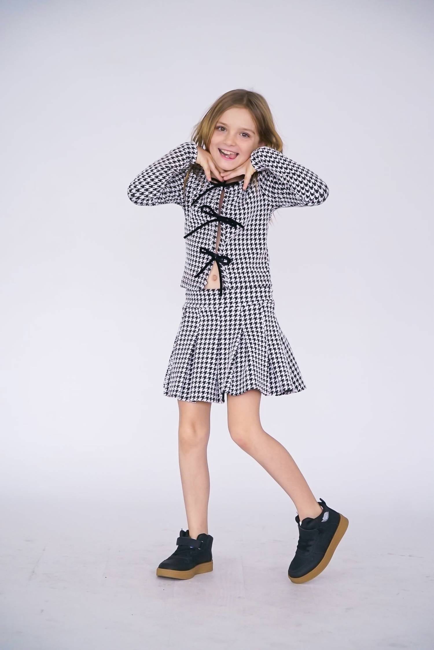 Elevate your girl's wardrobe with the Houndstooth Cardigan by Flowers by Zoe, a delightful preppy piece in timeless black and white plaid. This vacation-perfect cardigan features a collar neckline and long sleeves, exuding both style and comfort for spring outings. Closure: Tie closure. Ideal for fashion-forward youngsters, this cardigan embraces a classic pattern with modern elegance.