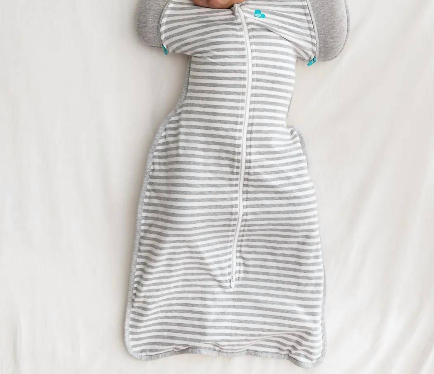 The Love to Dream Swaddle Up Sleep Sacks in Grey Stripe offer a gentle way to transition your baby from swaddling with its patented zip-off wings. Made from 95% organic cotton and 5% elastane, it ensures comfort for delicate skin while providing a snug fit with its hip-healthy design. The single-layered fabric is ideal for moderate climates, with a 1.0 TOG rating suited for room temperatures between 68°F and 81°F. Featuring a convenient twin zipper for easy diaper changes, this sleep sack is machine washable and tumble dryer friendly, available in sizes Medium and Large.