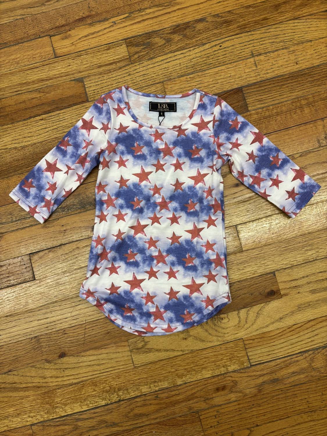 Introducing the Girls Basic Star Tee by Lucky & Blessed, a perfect choice for summer streetwear and vacation outings. This women's tee comes in a vibrant White Multi color and features a delightful star pattern that adds a playful touch to any outfit. With its long sleeves, it offers both style and coverage for those breezy summer days.