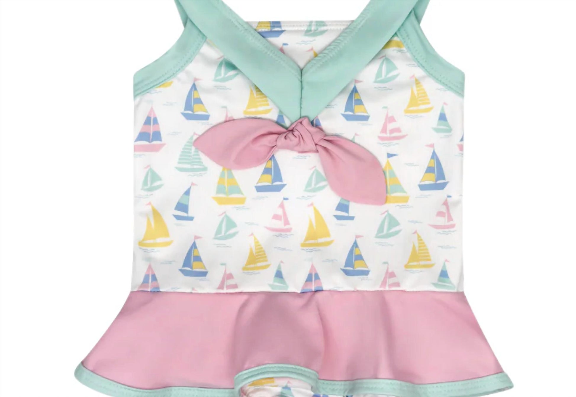 Introduce your little one to vibrant beach days with Lullaby Set's Nora Swimsuit in the custom Seahaven Sailboat design. This playful patterned one-piece features a classic coverage tankini top style, ideal for a Thanksgiving beach day or any sunny summer occasion. Crafted from polyester, this girl’s swimsuit reflects minimalist trends perfect for carefree adventures by the sea. Please note that detailed wash and dry instructions are not available for this item.