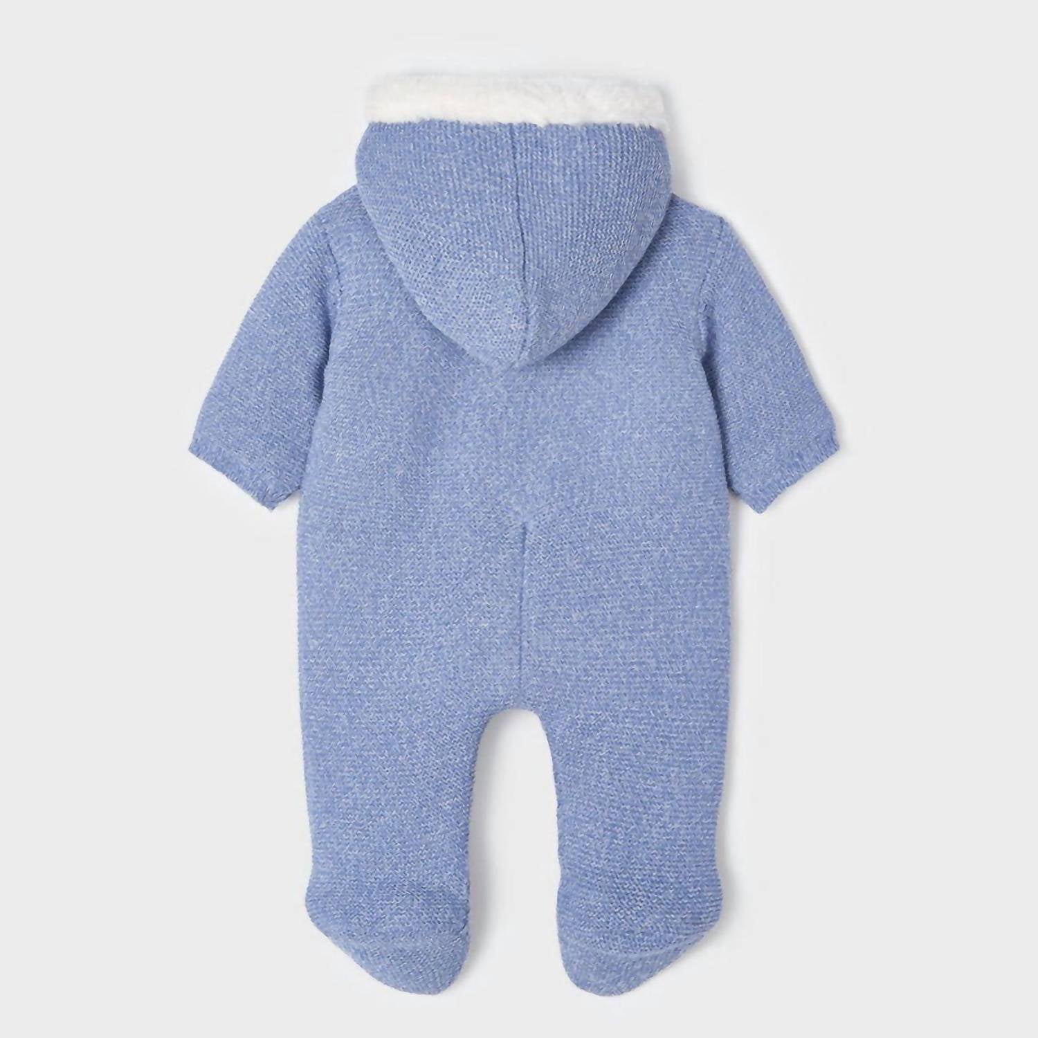 Wrap your little one in cozy warmth with the Mayoral Baby Boys Winter Knit Zipper Hoodie Jumpsuit in Blue Ice. Crafted from acrylic, this textured jumpsuit features a convenient zip-up closure for easy dressing. Perfect for winter outings, its hooded design ensures complete coverage. Ideal for travel, this vintage-inspired piece combines style and snugness.