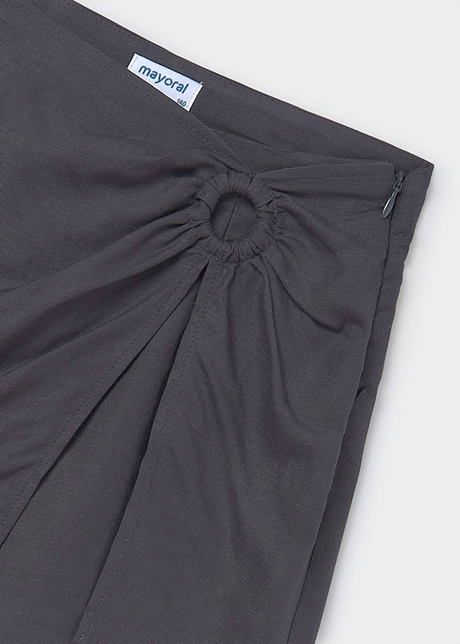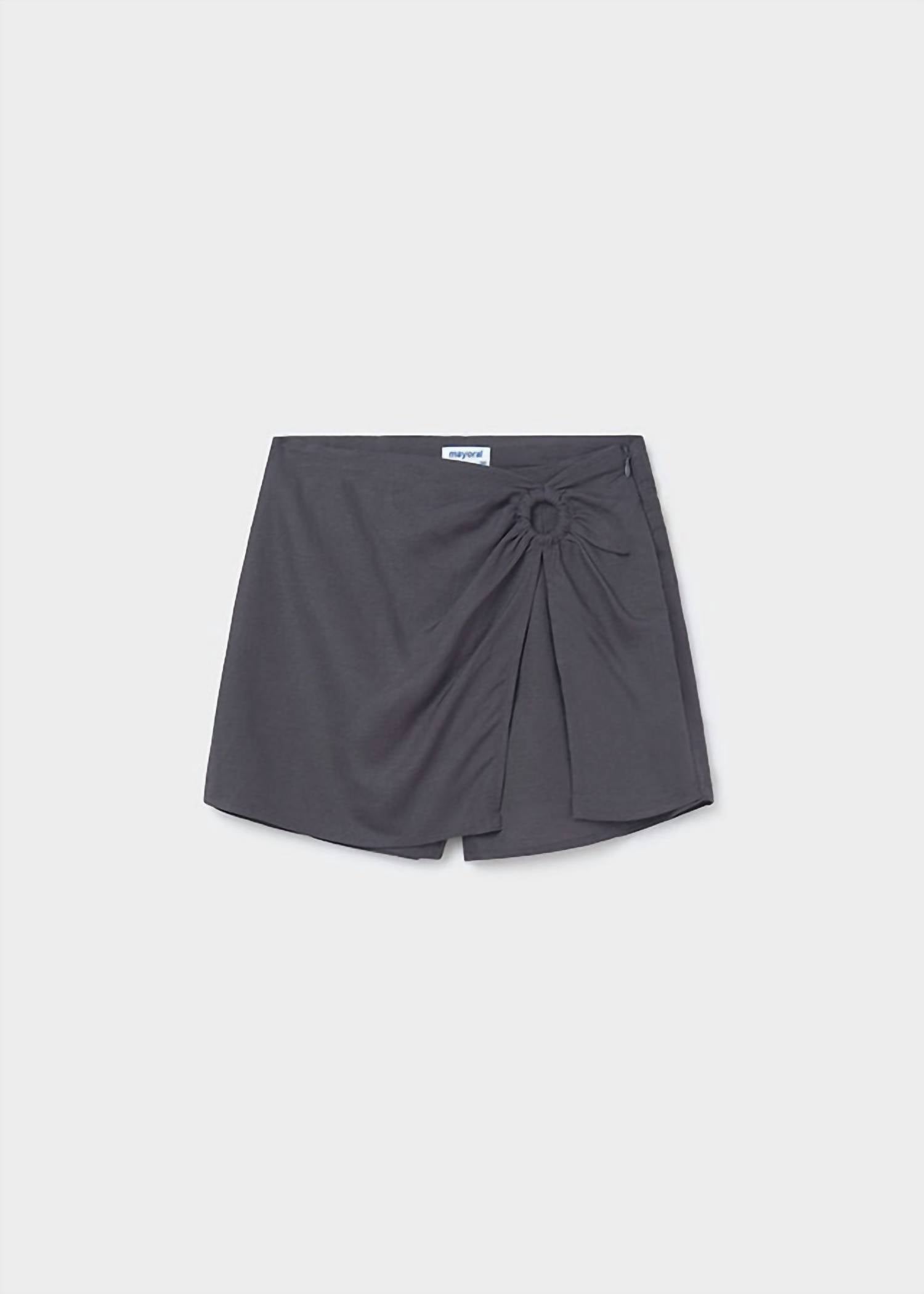 Introducing the Girl's Linen Skort by Mayoral in a chic coal shade, perfectly suited for a minimalist spring style. Designed with a wrap accent, this skort offers the comfort of shorts with the elegance of a miniskirt cut featuring an O-ring and slit accent. Crafted from a 78% Viscose and 22% Linen blend, it ensures a flattering drape and ultimate comfort. Closure: Invisible zip closure on the side seam. Care Instructions: Machine wash cold, line dry, and cool iron when needed.