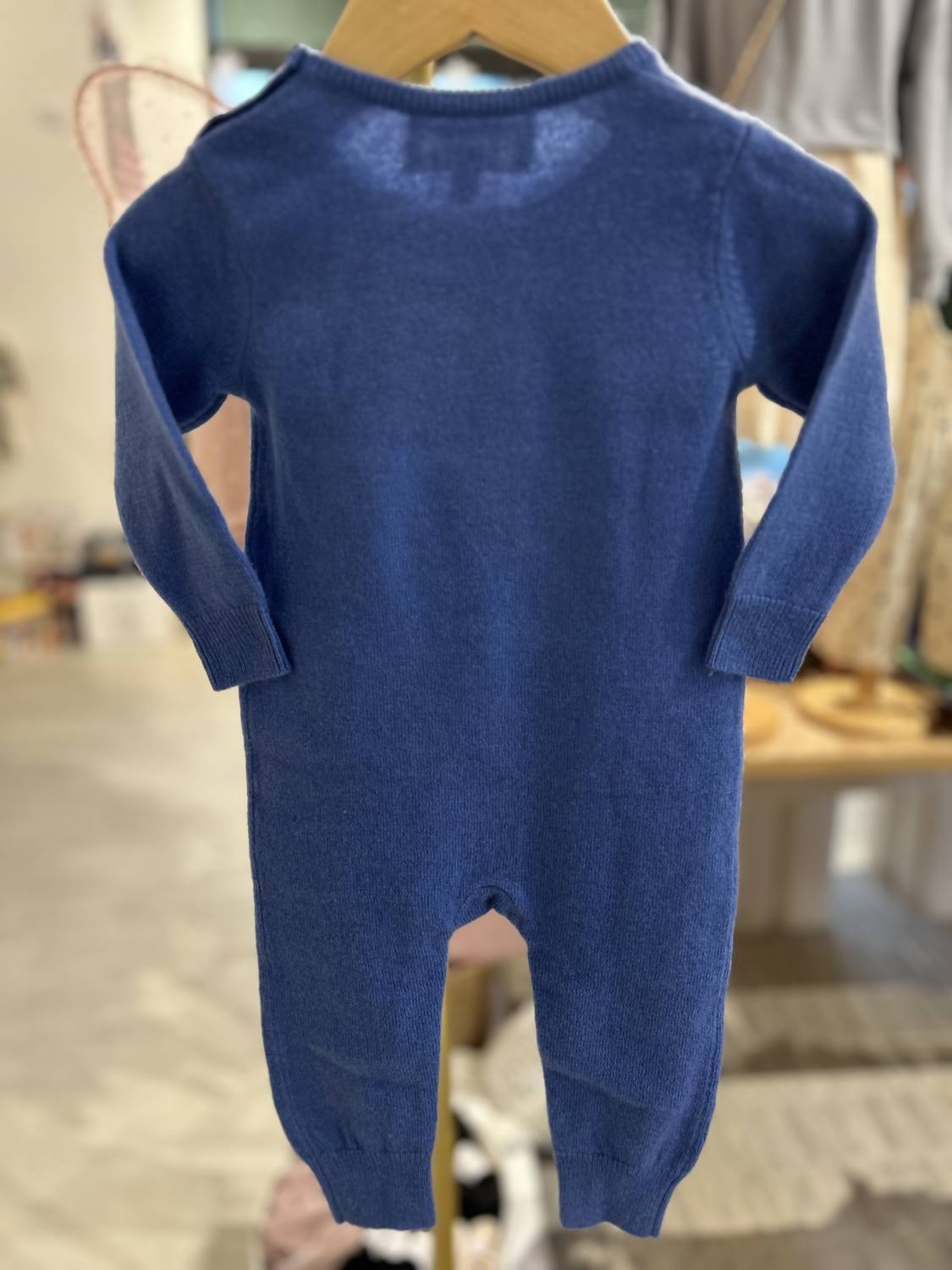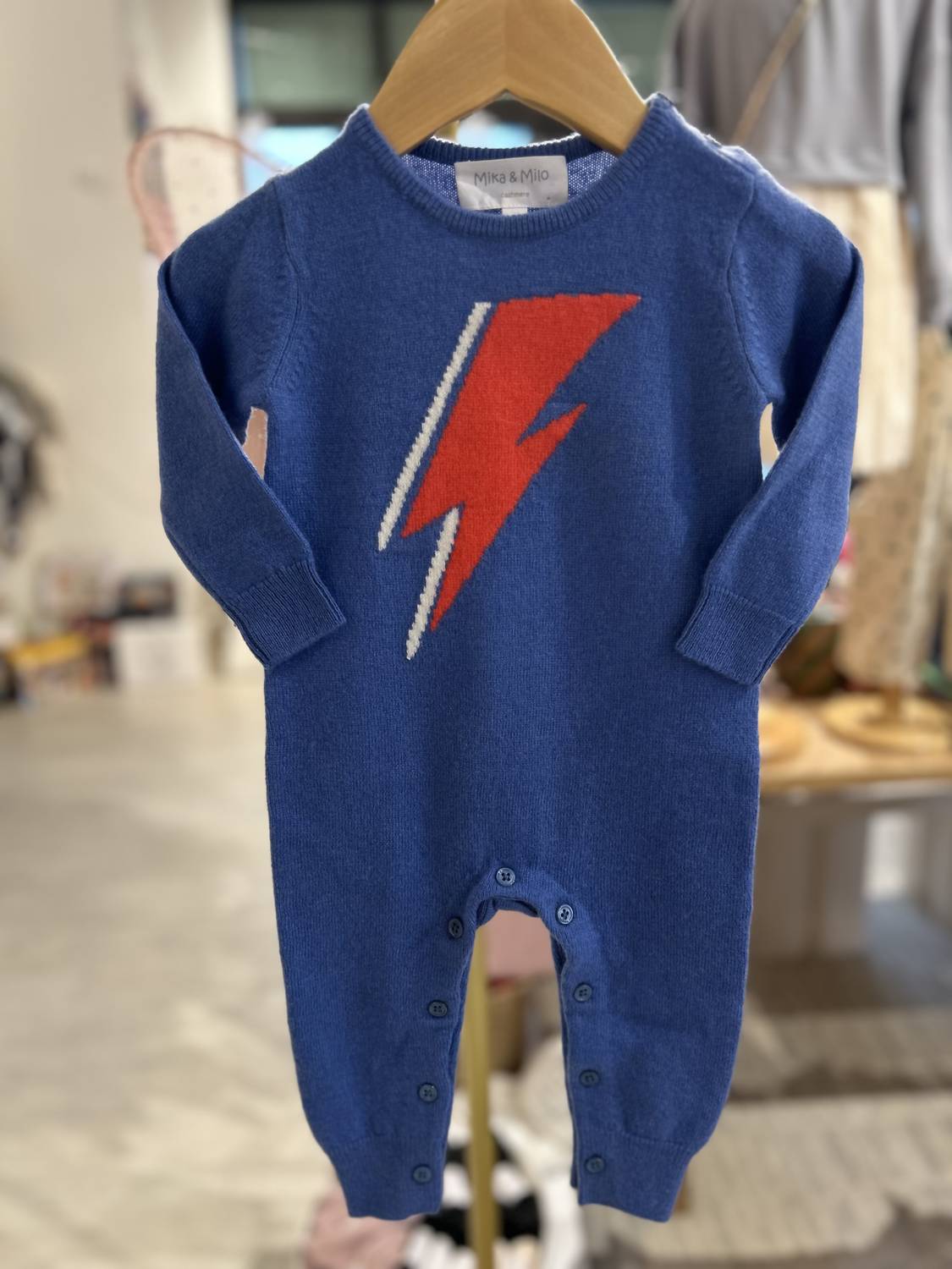 Introducing the Baby Lightning Bolt Jumper by MIKA & MILO in bright blue, a stylish and eco-friendly choice for winter travel. This patterned romper features buttons at the shoulder and down the legs, allowing easy changing. Crafted from 95% GOTS Organic Cotton and 5% ethically sourced cashmere, it offers a breathable yet warm experience, perfect for keeping your little one comfortably snug. Care instructions include hand wash and line dry to maintain its cloud-soft texture.