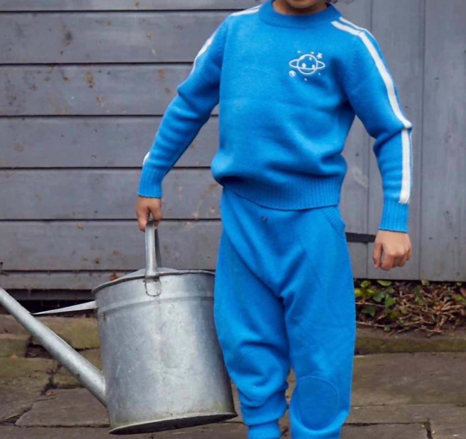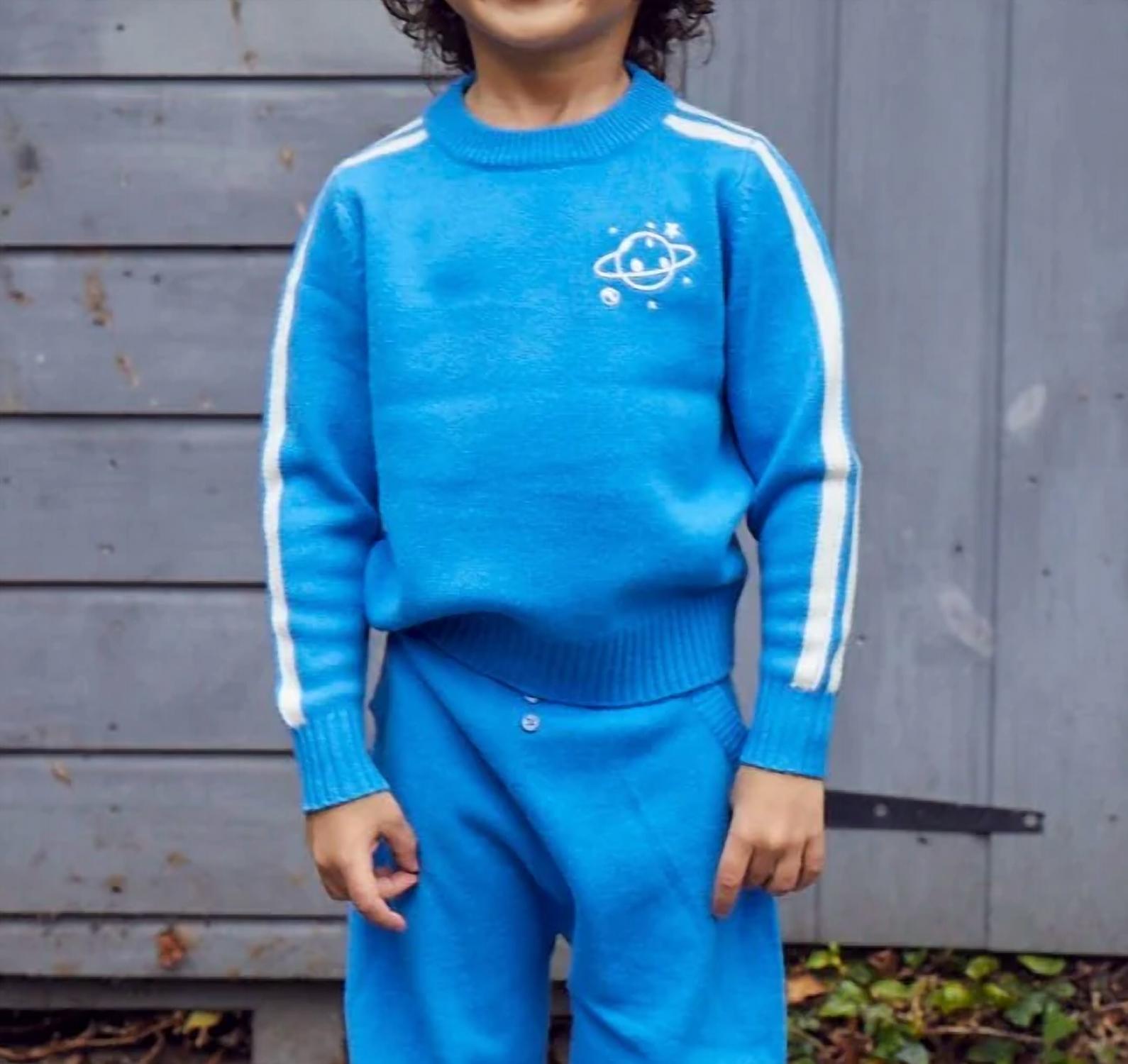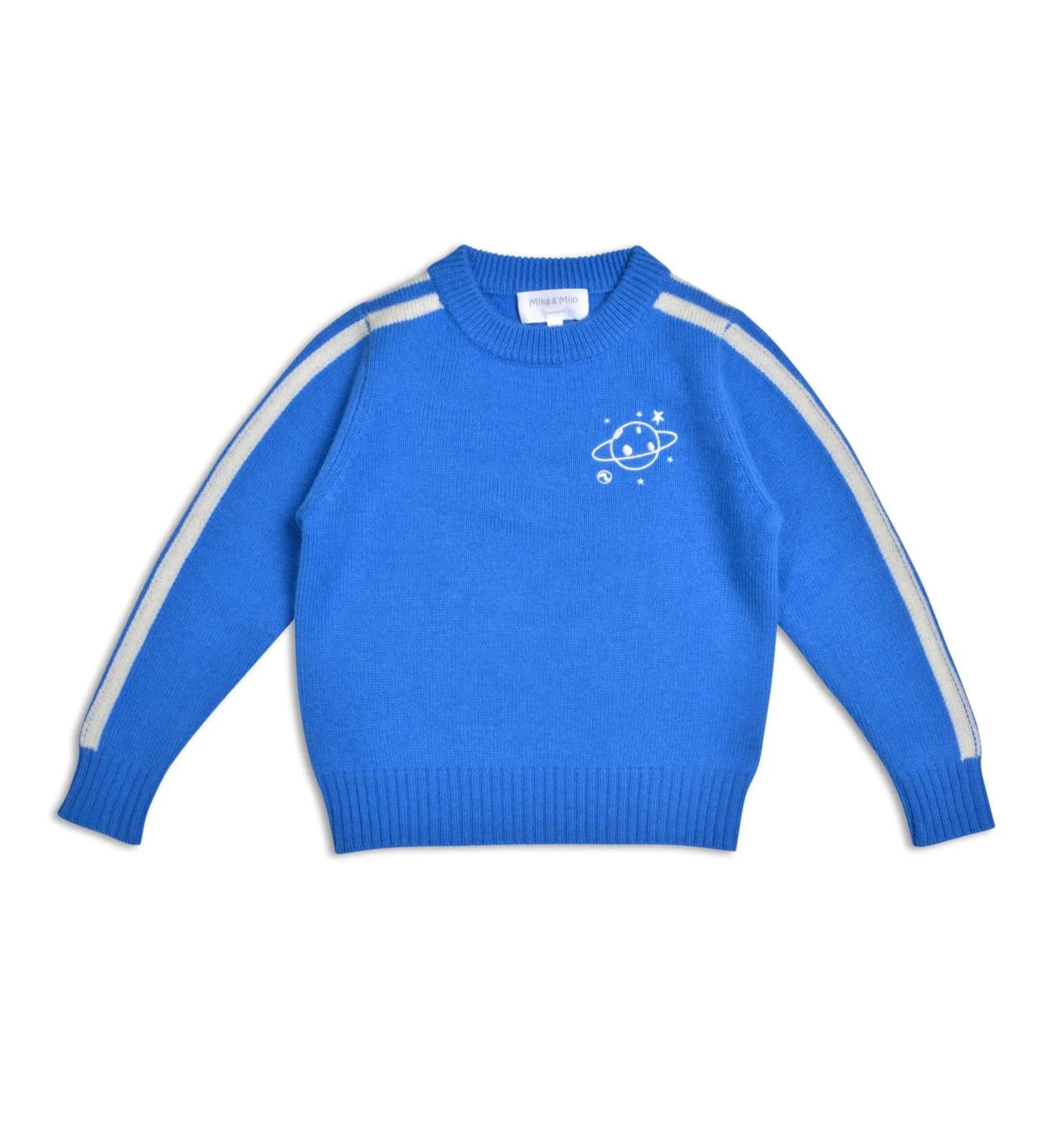 Introducing the Planet Jumper by MIKA & MILO, a standout piece in an eye-catching Azure hue perfect for adventurous boys. This sweater, adorned with an iconic planet motif and dynamic racing stripe accents, is crafted from a sustainable wool blend of 30% ethically sourced cashmere and 70% merino wool. Designed for the fall season, its double rib neckline allows for easy dressing, making it ideal for travel and preppy occasions. Embrace eco-friendly fashion with a traditional fully fashioned knit that reduces fabric waste by 40% compared to fast fashion.