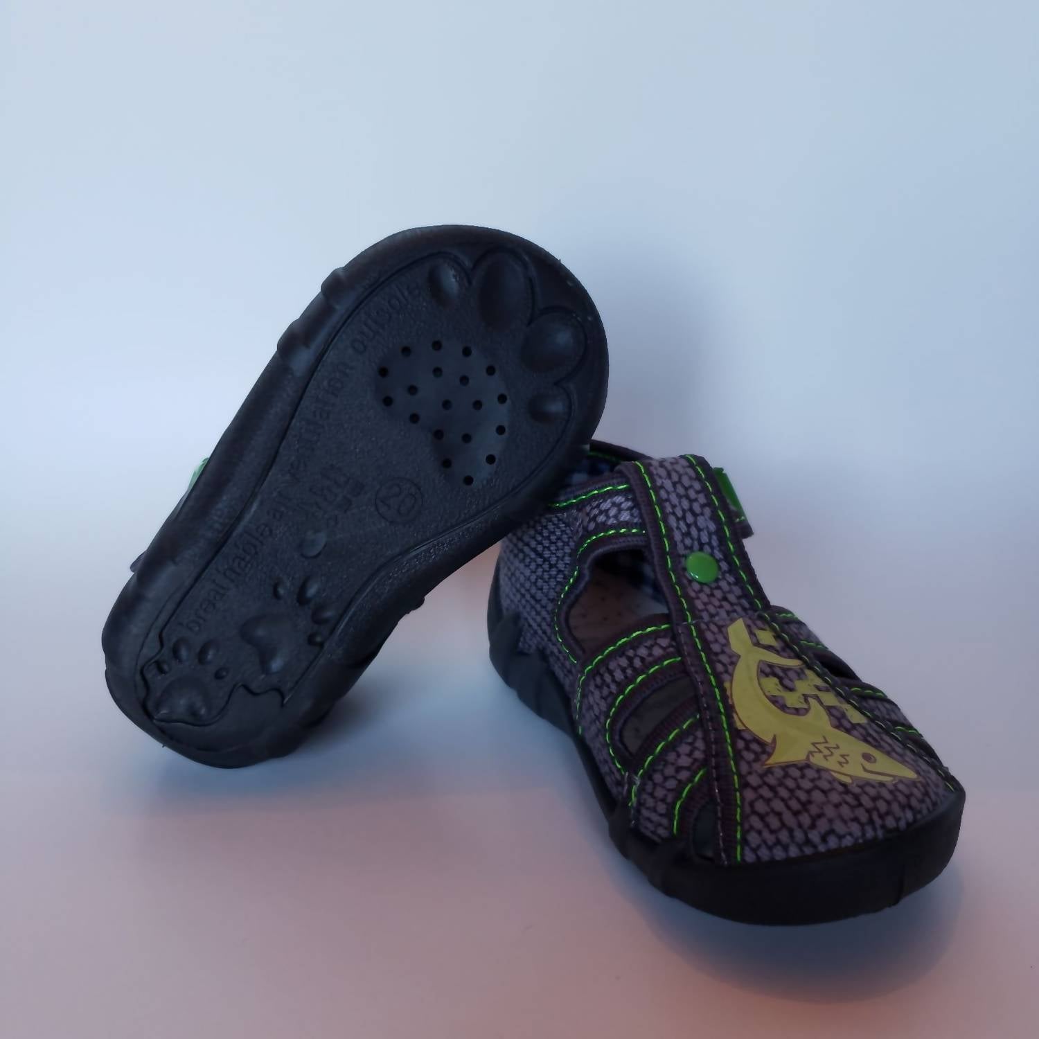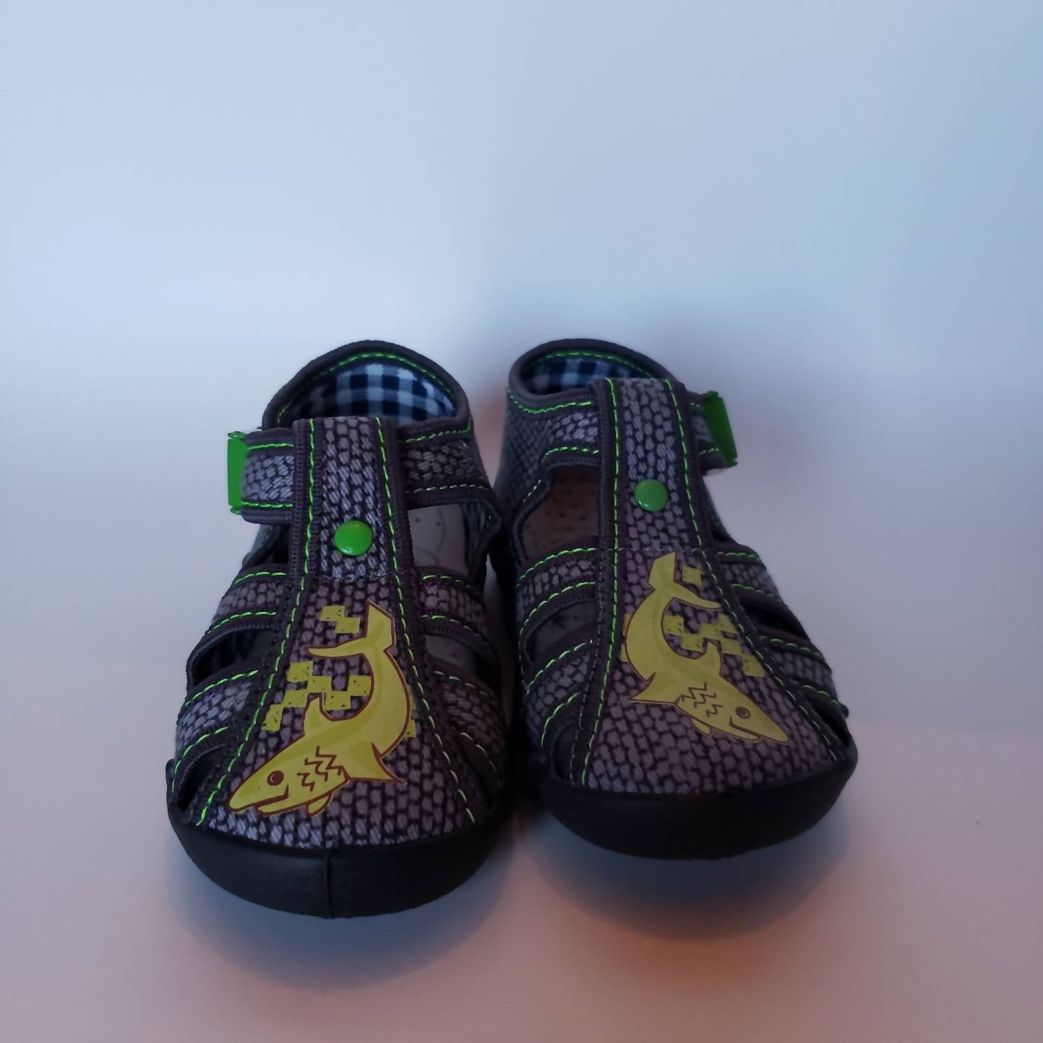 Discover the Renbut Shoes Kid's Fisherman Sandal in Dark Grey Multi with hark detail on toe, perfect for unisex toddlers who need comfort and support. Crafted with a natural cotton canvas upper and lined with natural cotton fabric, these sandals offer an orthopedic arch supportive sole aimed at nurturing healthy arch development. The one-strap clamp buckle closure makes them easy to slip on and off, providing convenience for active kids. Made in Europe, these lightweight sandals feature anti-slip flexible rubber outsoles and an anti-shock foam-padded insole lined with natural leather, enhancing their comfort and safety attributes.