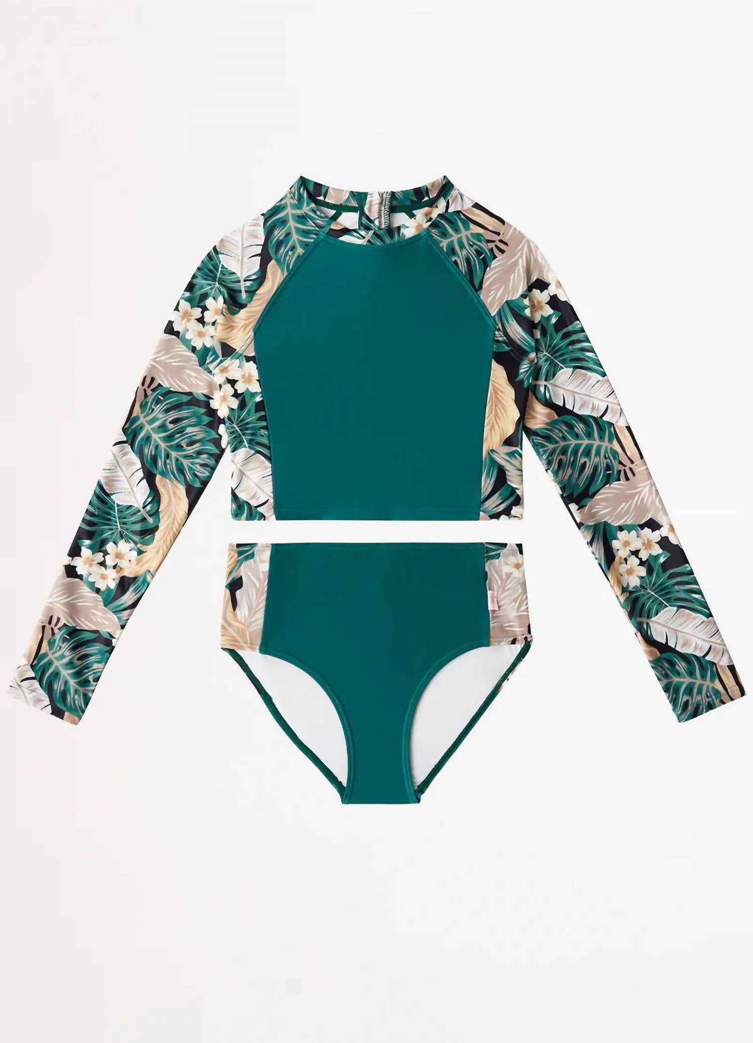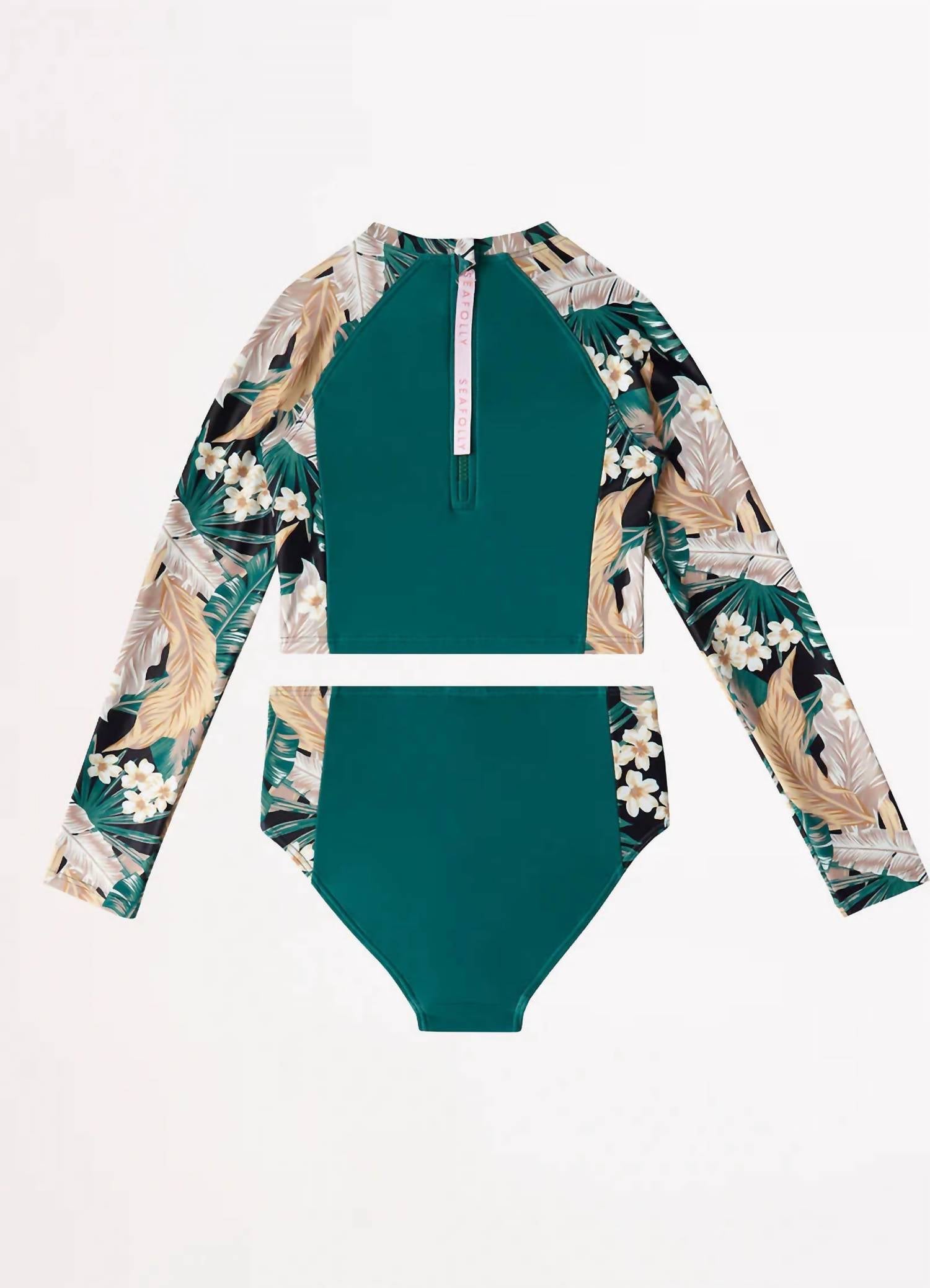 The Girl's Saint Lucia Surf Set by Seafolly is a stylish choice for a fun beach day, embodying vibrant 90s fashion trends. This surf set comes in an eye-catching green floral pattern and features long sleeves for added sun protection. Made from 95% Polyester, 5% Elastane, it ensures durability and comfort. The set includes a full coverage bottom with a convenient zip back closure. Care: Hand wash and line dry for longevity.
