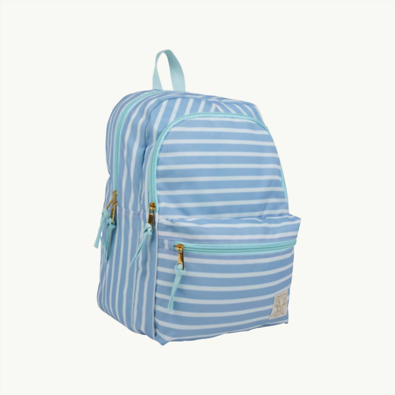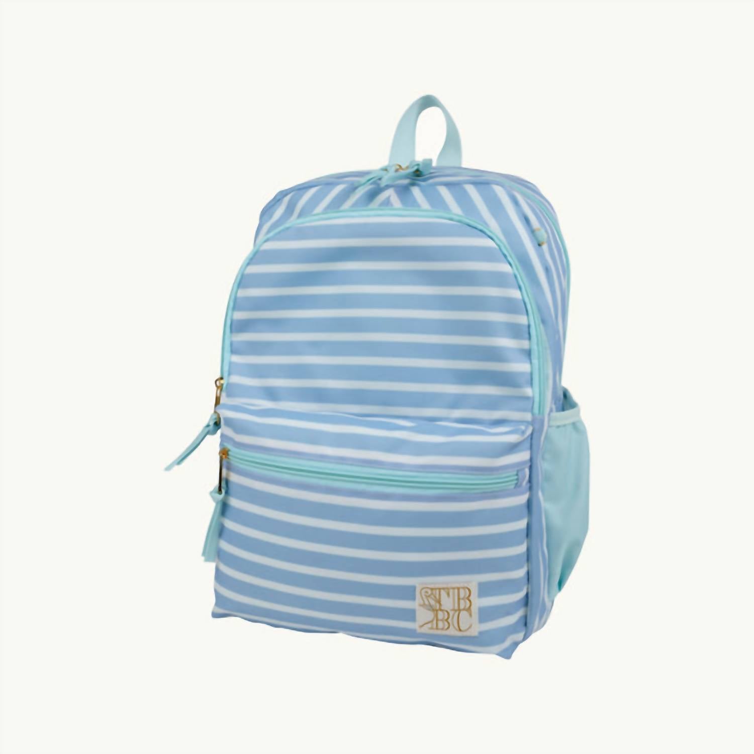 Introducing the Don't Forget Your Backpack by The Beaufort Bonnet Company, perfect for your little one's daily adventures. Crafted from durable polyester and styled in a charming Sarasota Sky Stripe, this bag is designed to stand out. It measures 15" in height, 7" in bottom depth, and 13" in width, ensuring ample space for essentials. Lightweight and practical, it's the ideal companion for any day out.