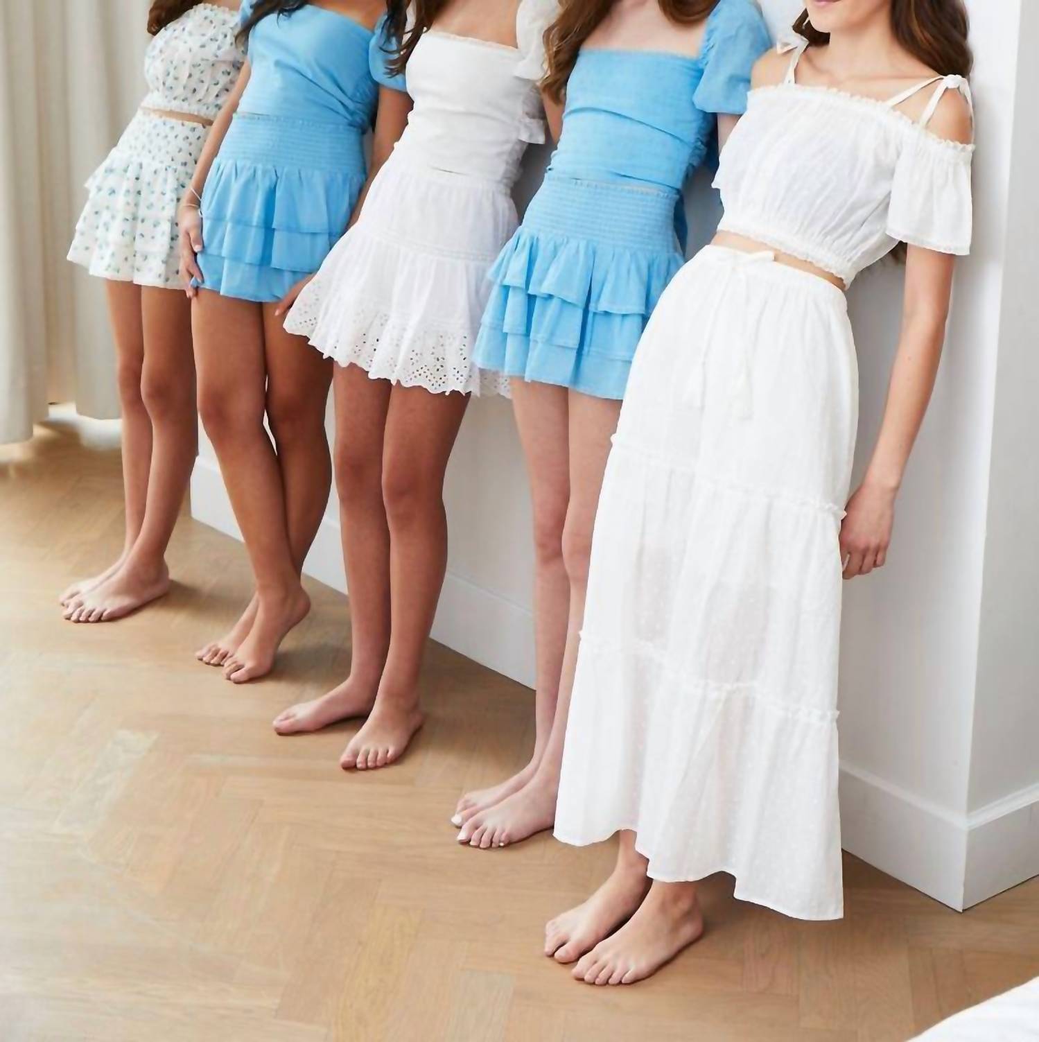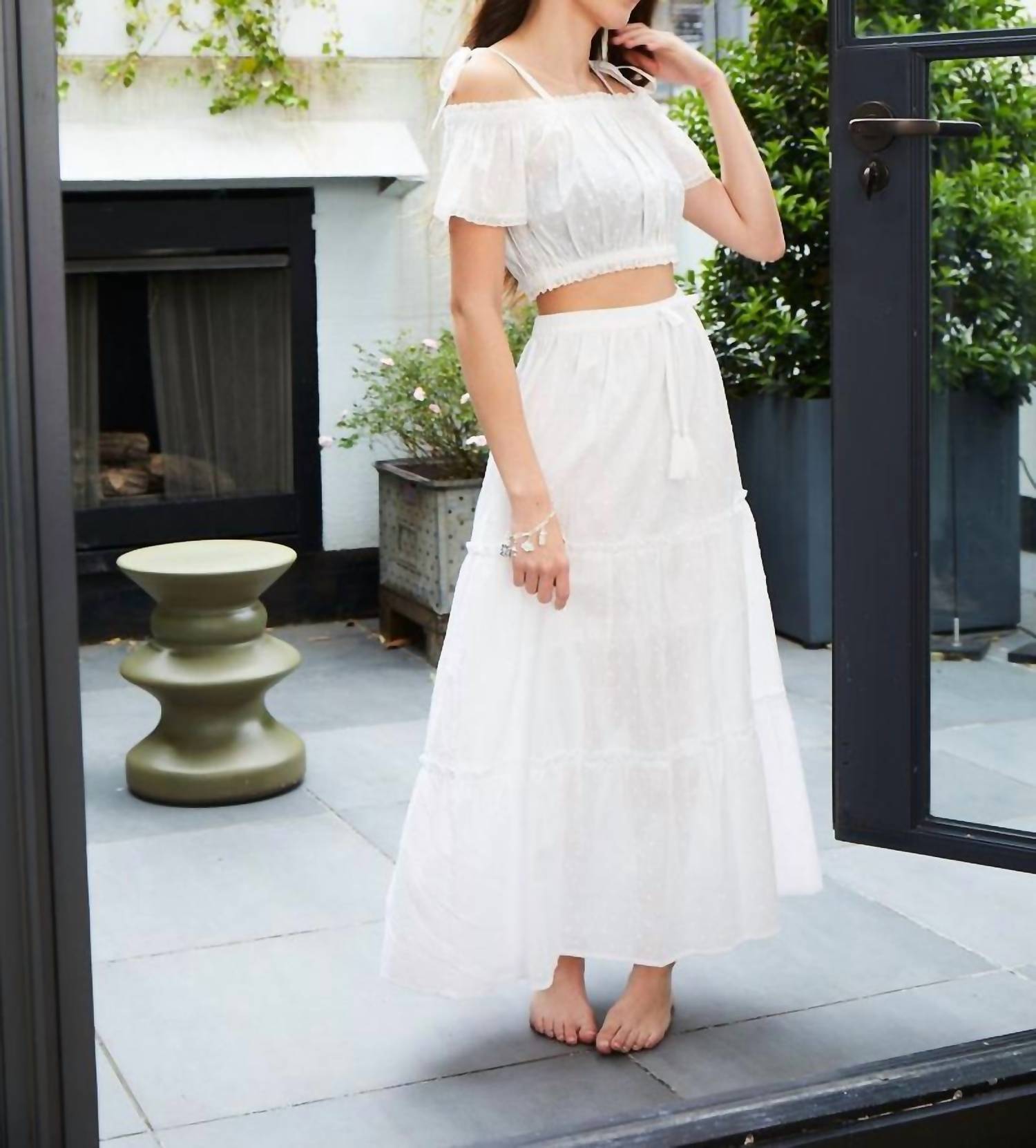 Meet the Bella Maxi Dot Tassels Skirt by THEME, an exquisite choice for an elegant occasion like church. This girls' skirt in pristine white is crafted from luxurious viscose, featuring a textured dobby pattern adorned with playful tassels. Care is a breeze with machine wash instructions.