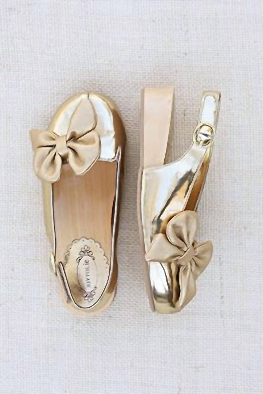 Delightful blend of style and charm. Closed-toe clogs feature a low flat heel and a playful slingback ankle strap with a buckle closure, perfect for holiday parties, Christmas, or weddings. A large, soft, gold-colored bow adorns the front, beautifully complemented by a subtle scalloped design around the top opening. Designed in a shiny metallic gold, embrace the 90s fashion trend, making them a stylish choice for toddlers.