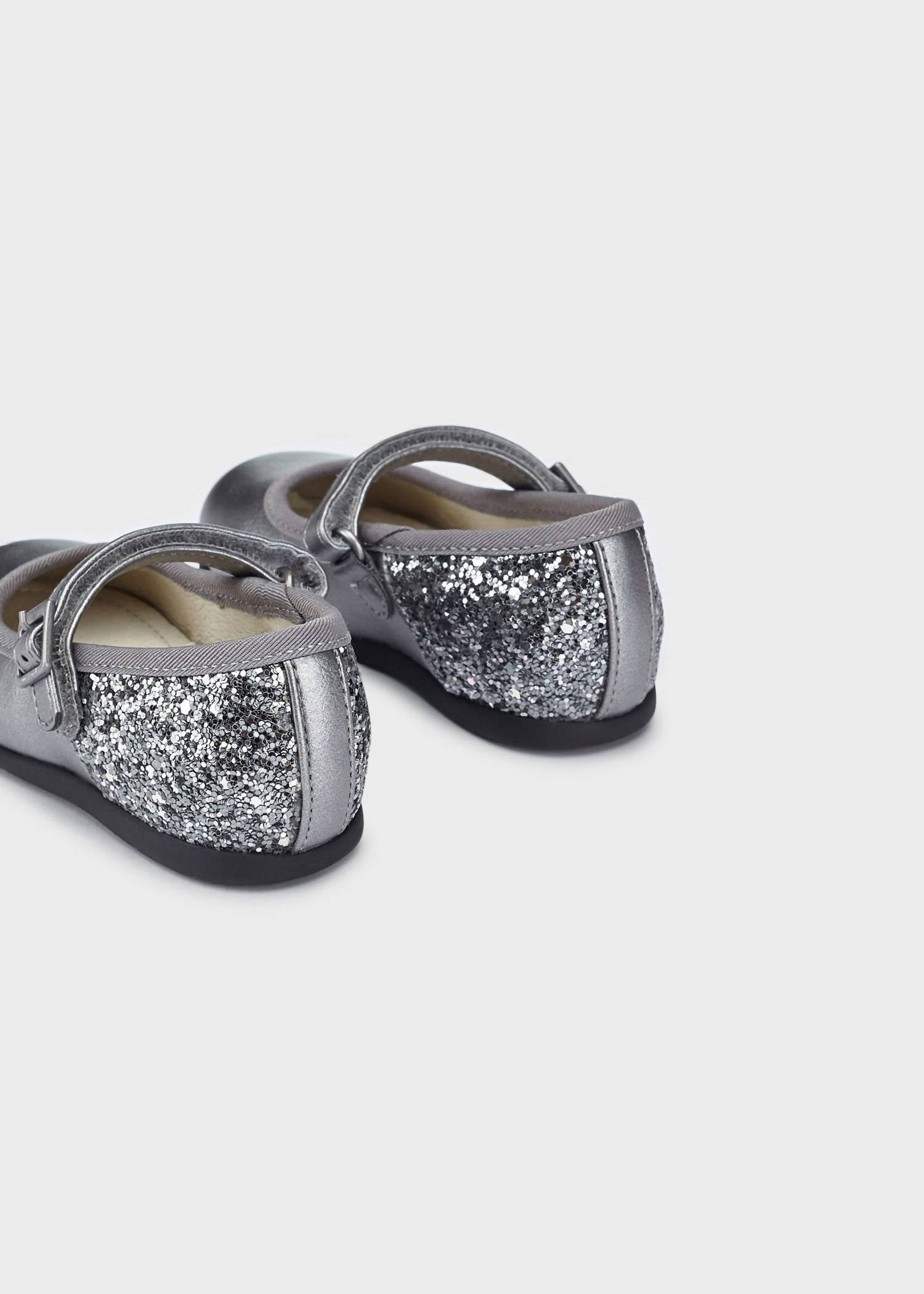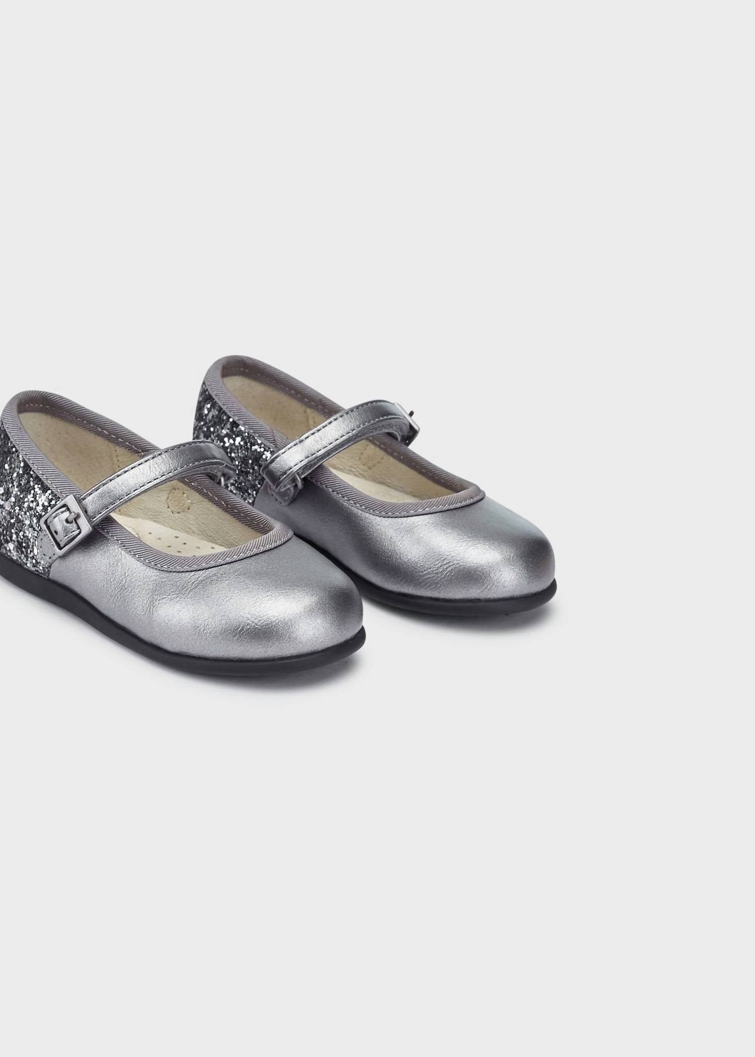 Delight your toddler's heart with the Mayoral Kid's Glitter Mary Jane Flat in stunning Mercury. These dress shoes feature a breathable faux leather body accented by a shimmer & glitter finish, complete with a faux buckle strap and adjustable velcro closure for easy wear. The shoes boast a composition of 68% Polyurethane, 16% Polyethylene Terephthalate, 11% Cotton, and 5% Resin, offering style and comfort, complemented by a leather and cotton padded insole and black rubber non-slip grip soles. Designed with a round toe and flat heel for summer streetwear occasions.