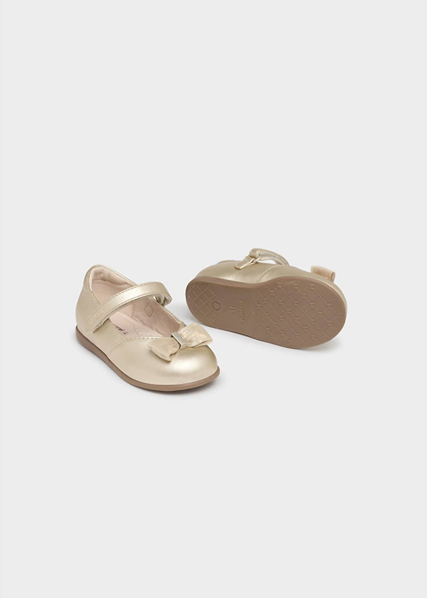 Unveiling the Mayoral Girls' Ballerina Flat with Bow Detail, designed in a charming gold hue perfect for your little one's dressy occasions. This flat shoe features a secure over-the-foot strap and a sweet bow on the round toe, offering both style and comfort with a medium width fit. Ideal for holiday parties or summer events, this Quiet Luxury trend piece defines elegance with a carefree flat heel. Perfectly crafted for little kids, these shoes are set to shine at any Valentine's Day event.