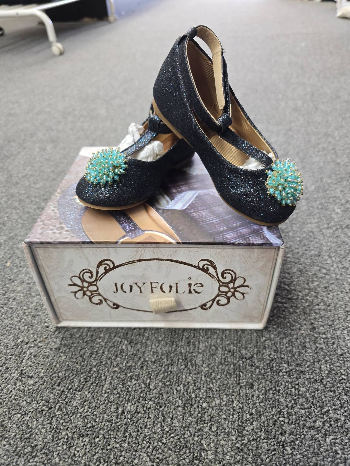 Delightful pair perfect for any holiday party. Sparkle with a glittery finish and feature a single strap for a secure fit. Each shoe is adorned with a bright turquoise pom-pom-like embellishment on the rounded toe, embracing the playful Y2K trend. Crafted for little ones and ideal for Thanksgiving festivities, these shoes come stylishly presented in a decorative, vintage-style Joyfolie shoebox.