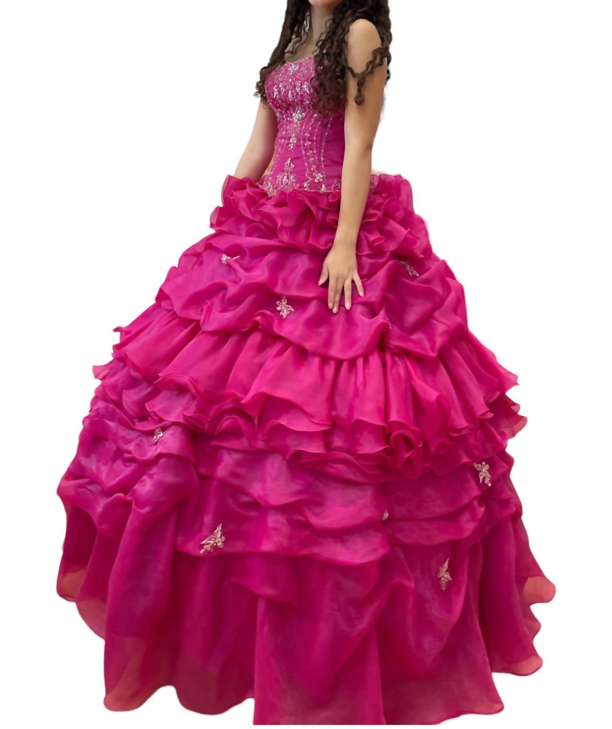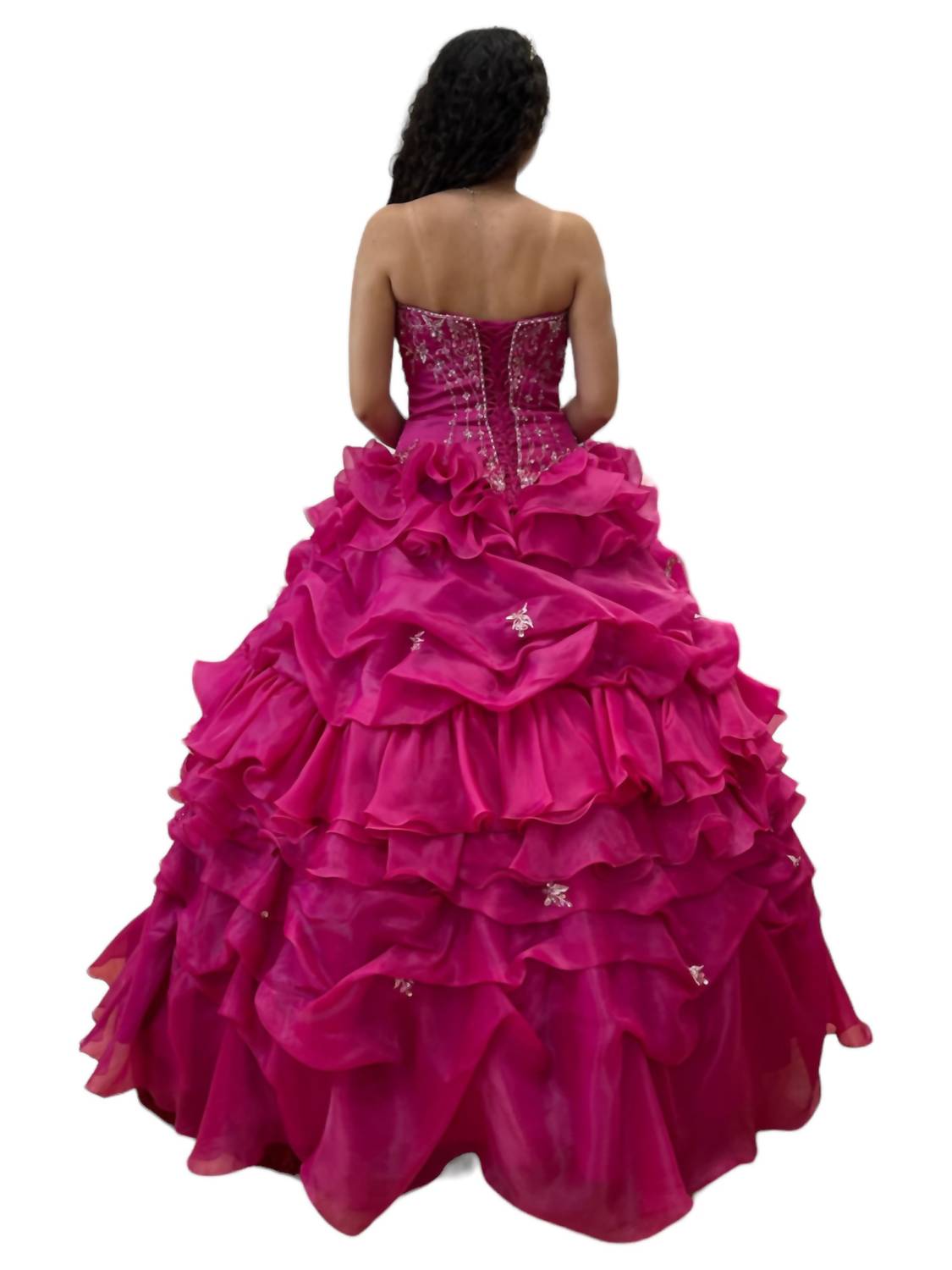 This Off Shoulder Quinceañera Dress features an off-shoulder design and intricate patterned detail. Its figure-flattering silhouette ensures a confident and stunning appearance, perfect for making memorable moments on your special day. Measurements B38, W30, H42.