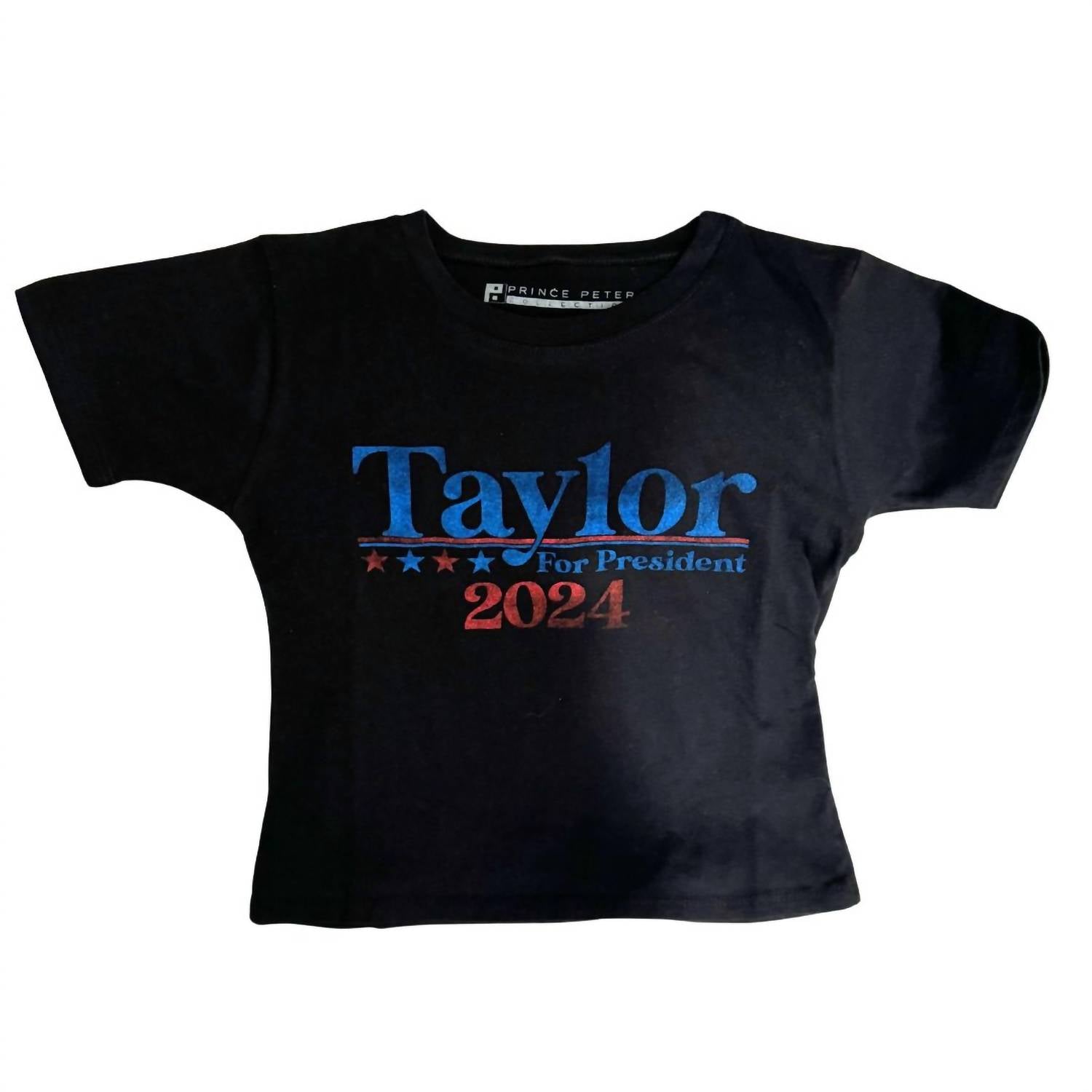 Introducing the Girls Taylor for President Tee by Prince Peter, a must-have graphic tee that your little one will adore. Featuring short sleeves, this tee is crafted from soft cotton in a vintage black wash, ensuring ultimate comfort and style. With its classic fit, it's perfect for any occasion and fits everyone effortlessly. Care for this tee is a breeze with machine wash instructions.