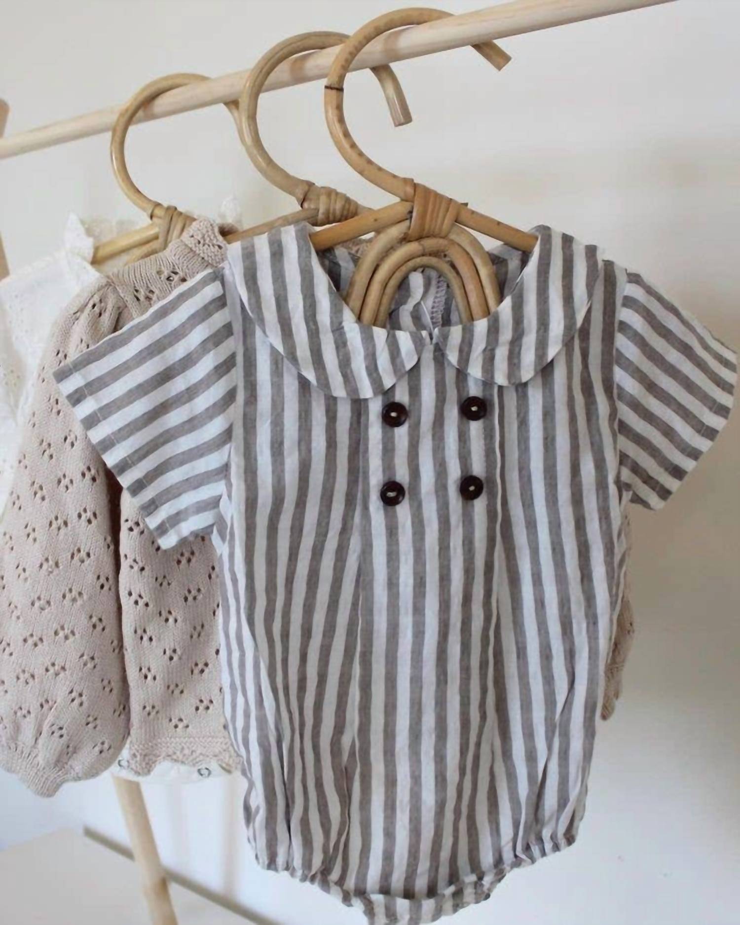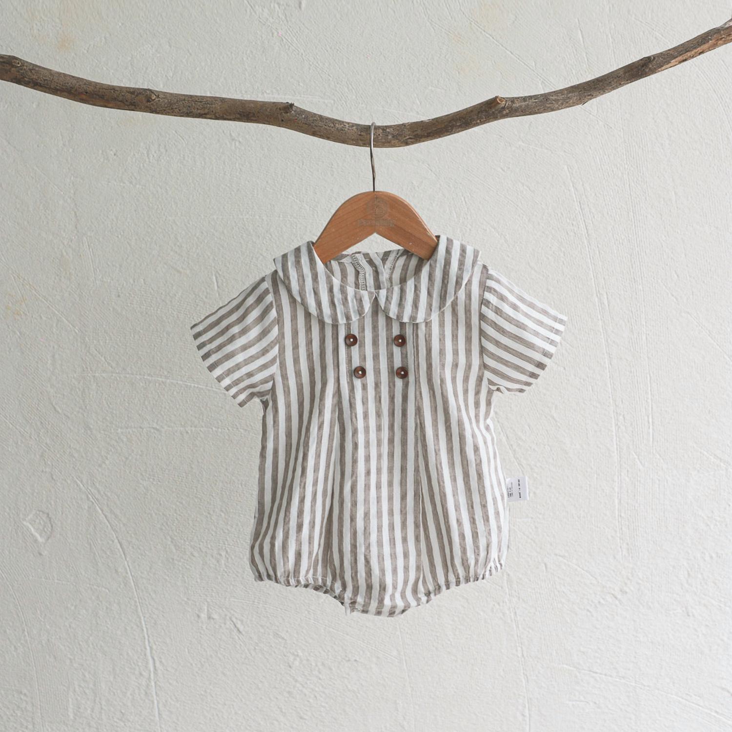 The Annie & Charles Organic Cotton Pim Bloomer Romper is an adorable piece for your little one, featuring a sweet collar and a charming light grey striped pattern. Crafted entirely from organic cotton, this romper provides both softness and comfort. Made in Austria, it ensures quality with every stitch. Care is simple with machine wash instructions, allowing for easy maintenance.