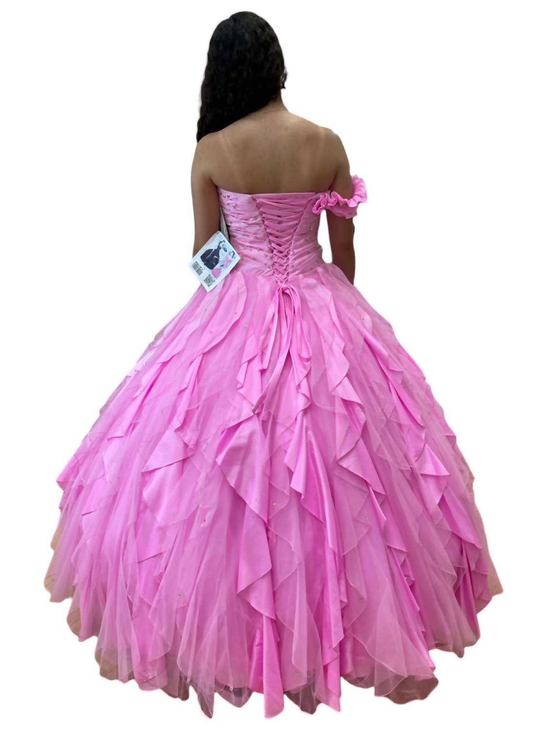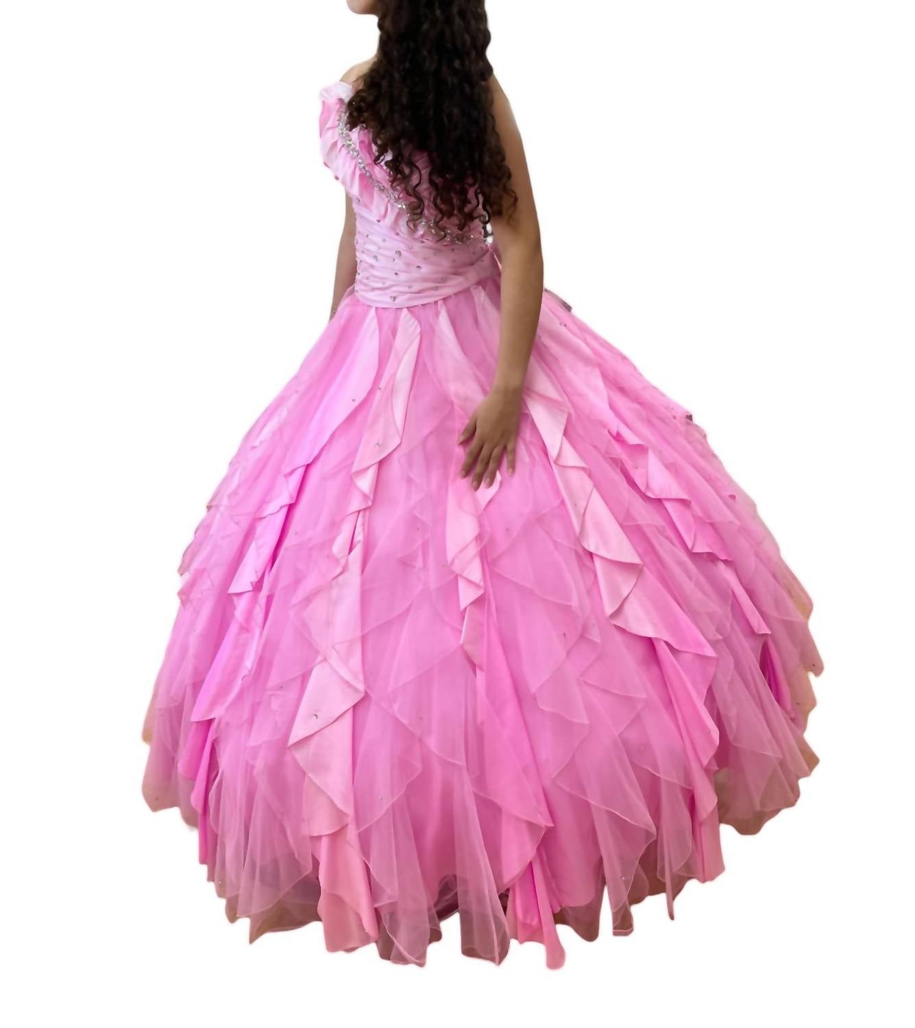 This One Shoulder Quinceañera Dress features a one-shoulder design and intricate pattern work. Crafted to accentuate your natural elegance and offer comfort, it ensures a striking silhouette and memorable presence on your special day. Measurements B35, W28, H39.