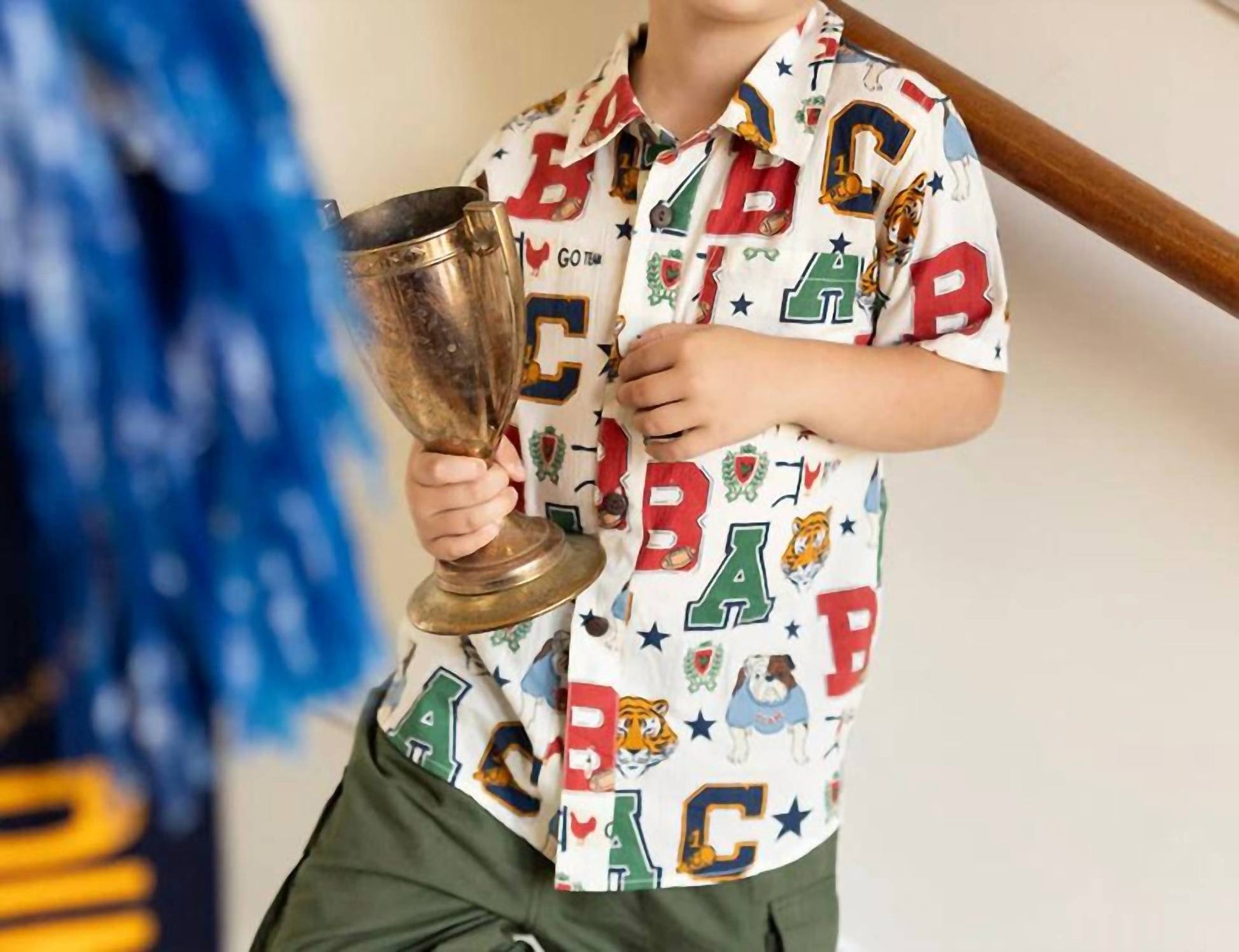 Your favorite mascots, including our very own Pink Chicken, stand proud against a crisp white ground in this super fun print. Short sleeve. Collared. One front pocket at chest. Faux coconut buttons. Machine wash cold, gentle cycle, hang to dry, cool iron. 100% cotton cambric. Made in India.