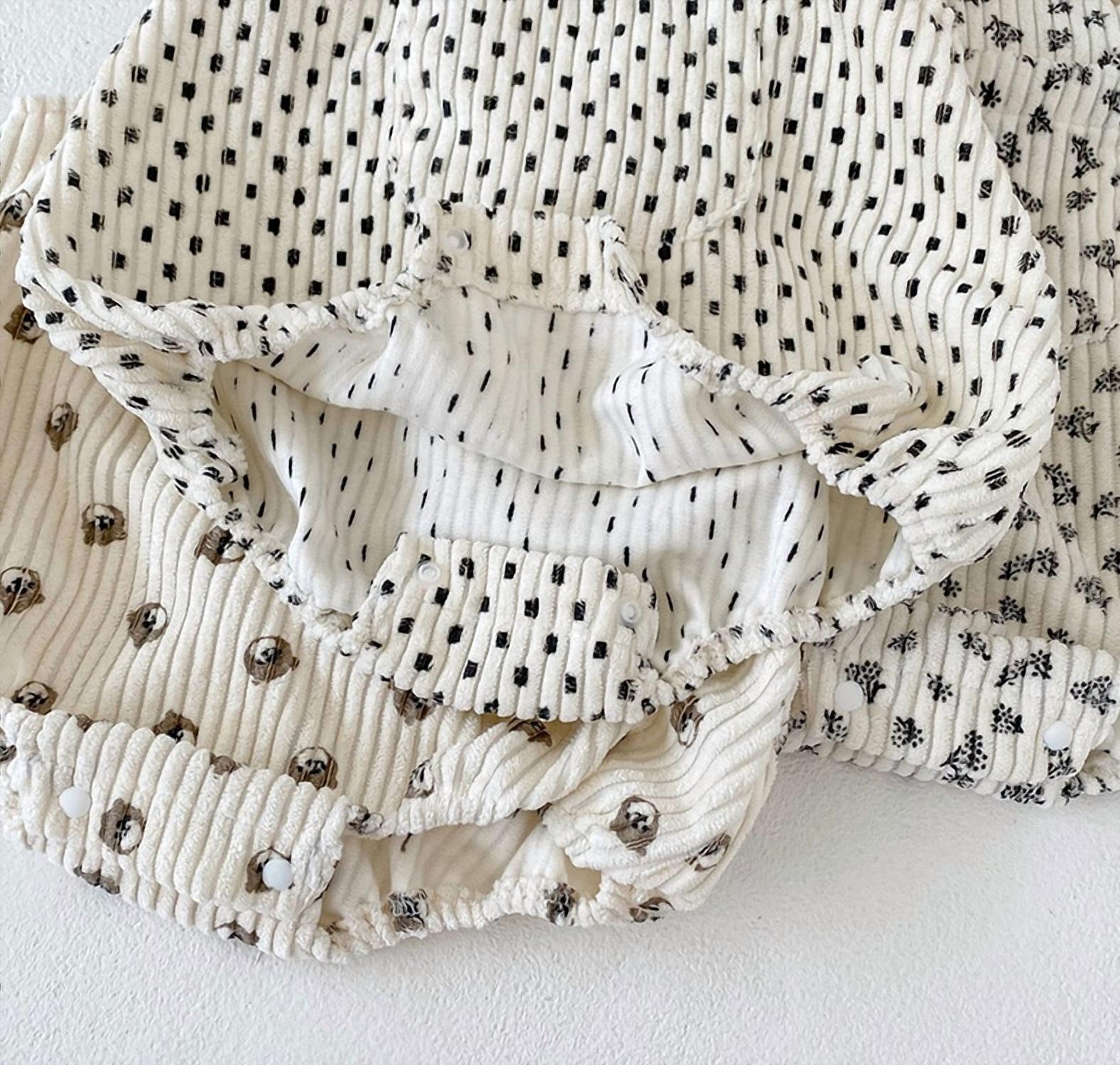 Annie & Charles present the Baby Girl's Lou Bodysuit With Bib, a delightful romper perfect for seasonal transitions. Crafted from soft cotton, this romper features a charming polka dot pattern in a chic white with black dots. Designed for baby girls, it includes stylish button detailing. For convenience, it is machine washable.