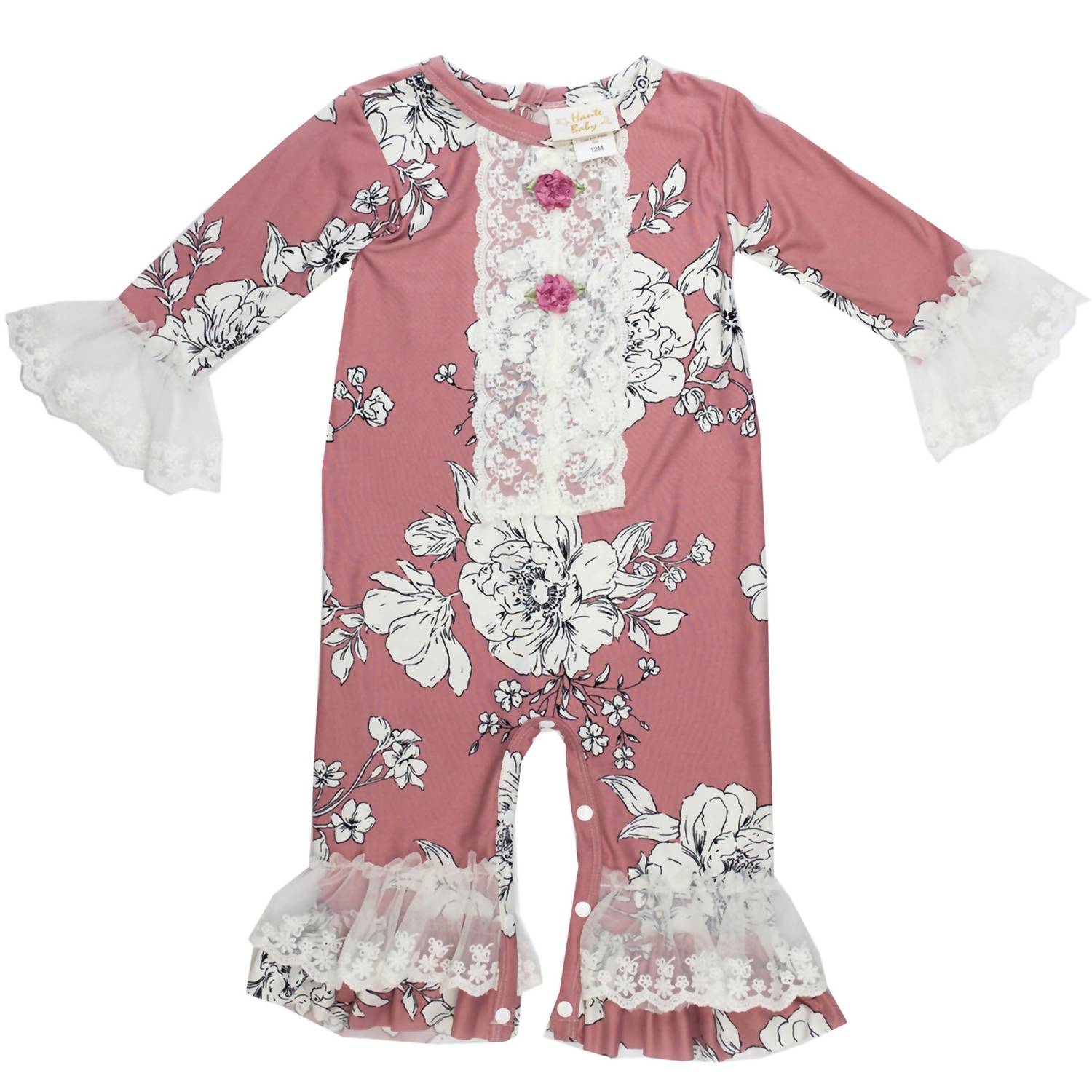 Meet the Baby Girls Sweet Blush Romper by Haute Baby, a delightful choice for your little one's wardrobe. With charming long sleeves adorned with sheer antique lace at the wrists and a lace bodice accented with two peach florettes, this romper is ideal for special occasions. Made in the US from 100% polyester, it showcases matching vintage lace at the ankles for a cohesive look. Ideal for baby girls, this floral-patterned romper is available in a lovely blend of pink, white, and grey.