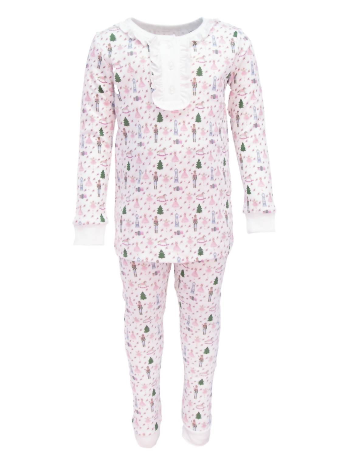 This Pima cotton pajama set includes a long-sleeved top and pants. The top features a ruffled button placket and cuffed sleeves, while the pants have an elastic waistband and cuffed legs. The set is printed design on a white background.