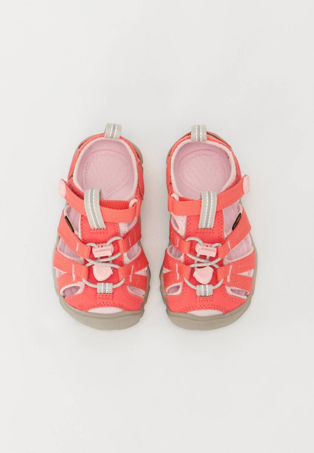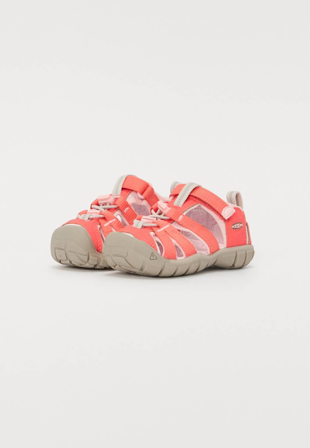 Introducing the Kids Seacamp II Sandals by Keen, perfect for little girls who love summer adventures. These water-resistant sandals, in eye-catching Dubarry/Giggle Pink, feature a washable polyester webbing and quick-dry lining. The lace lock bungee capture system, combined with an adjustable hook and loop strap, ensures a secure fit and effortless on-off action. Designed for travel and streetwear occasions, they offer excellent traction with multi-directional lugs and a non-marking rubber outsole. Care: Machine washable on gentle cycle, air dry.