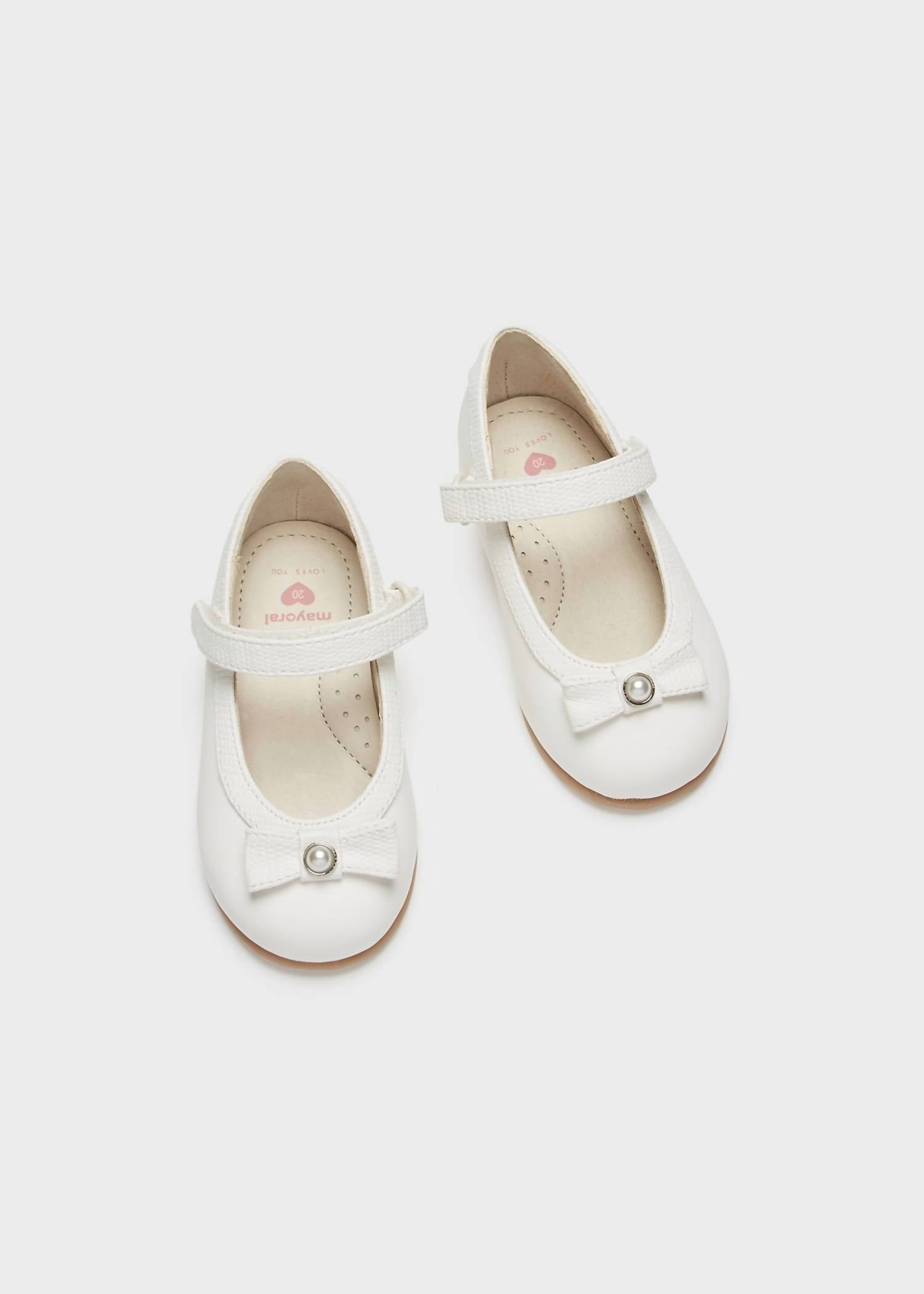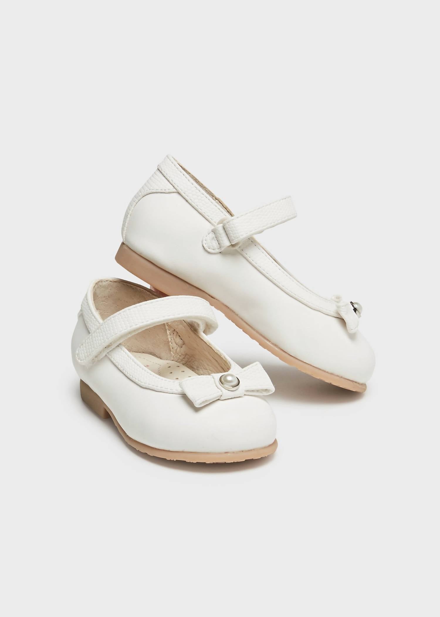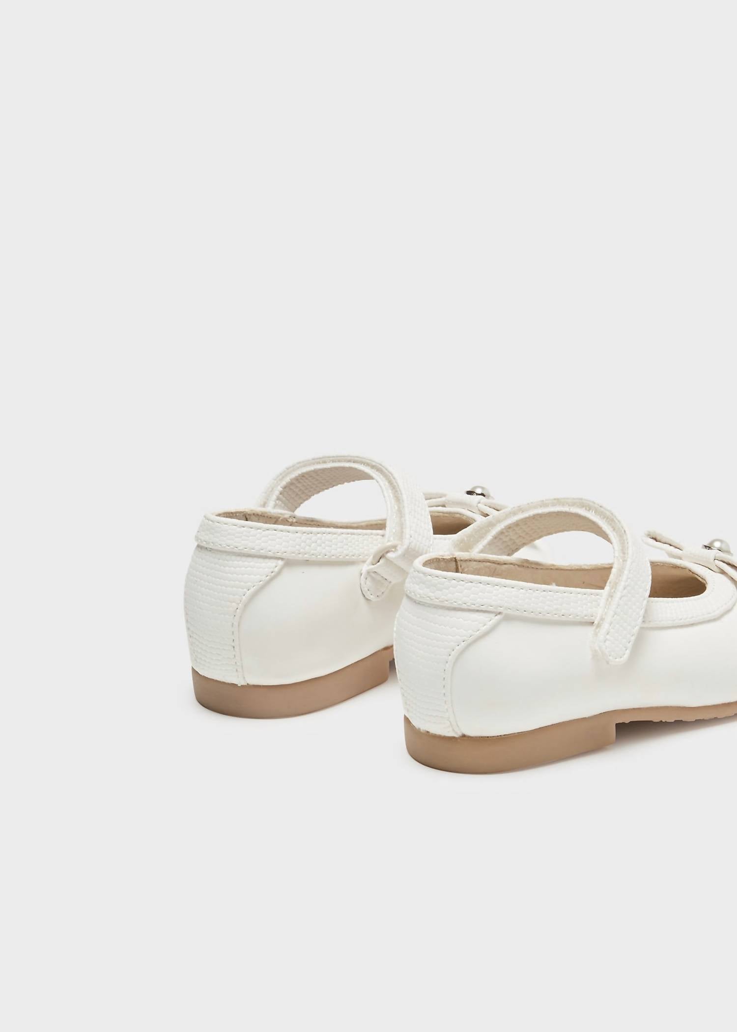 Introducing the Kid's Snakeskin Trim Mary Jane by Mayoral, a chic flat heel perfect for little girls. This ballet flat, crafted from bone-hued faux leather, features a unique python embossed trim and a charming bow accent with a silver-accented pearl at the toe. The adjustable Velcro strap ensures a comfortable fit, while the padded insole and beige textured rubber outsole offer extra comfort and durability. Composition: Court and instep are 100% Polyurethane; Lining and insole are 100% Pigskin; Sole is 100% Synthetic Material.