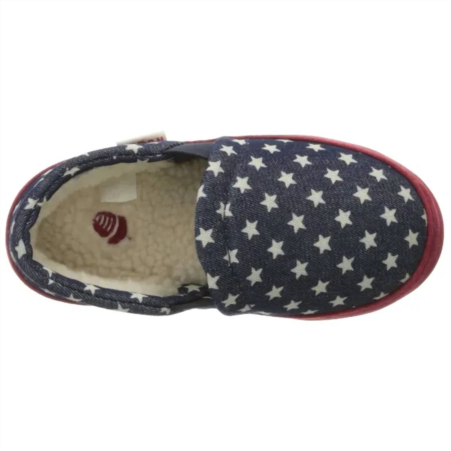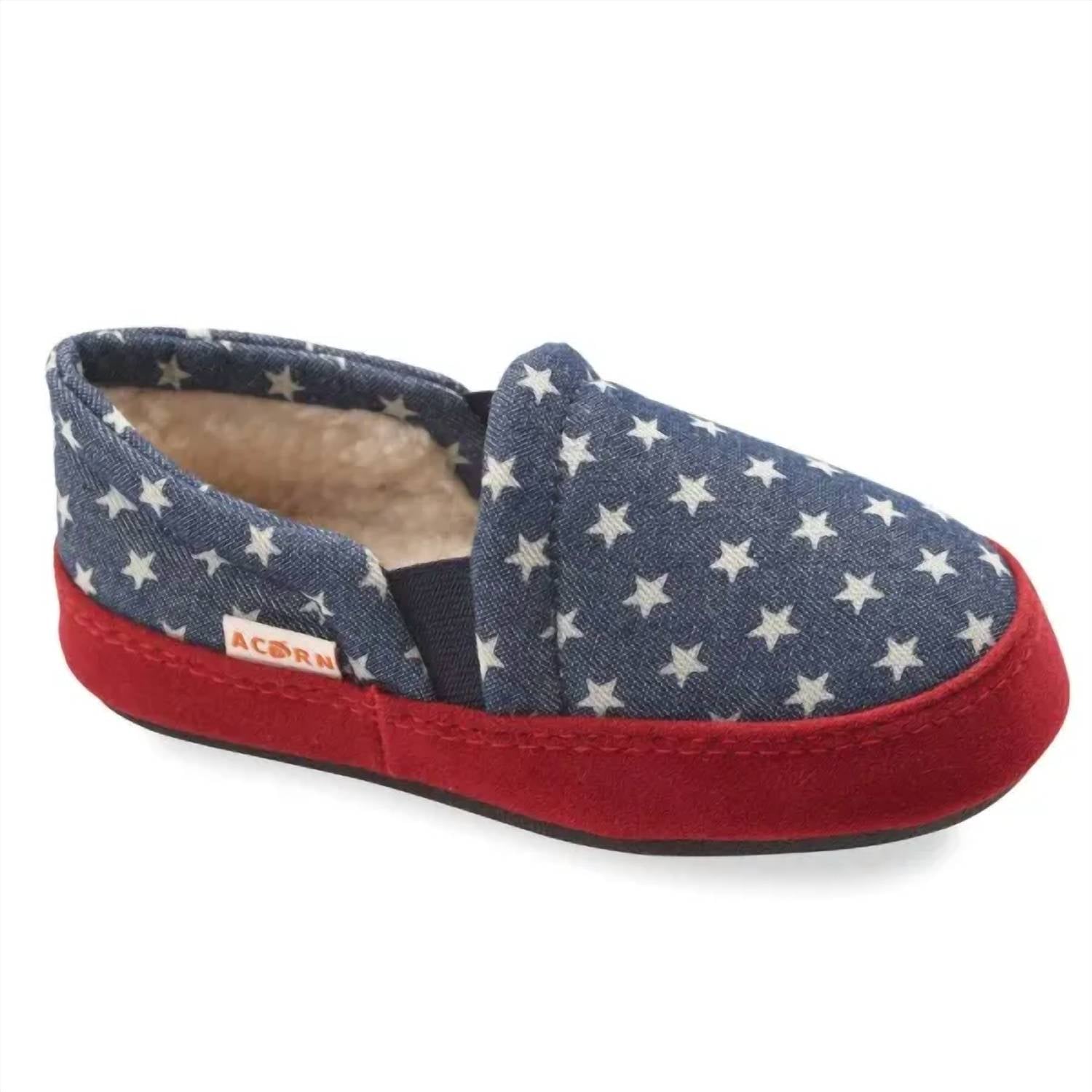 Introducing the Kids Colby Gore Moc by Acorn, designed for big kids with a playful Navy Stars pattern. These slippers, crafted with a warm faux fur lining, feature durable suede sidewalls and a round toe shape for enhanced comfort and longevity. The flat heel and non-slip, weatherproof sole make them suitable for both indoor and outdoor adventures. Experience ultimate comfort with memory foam insoles over a featherweight EVA cushion layer.