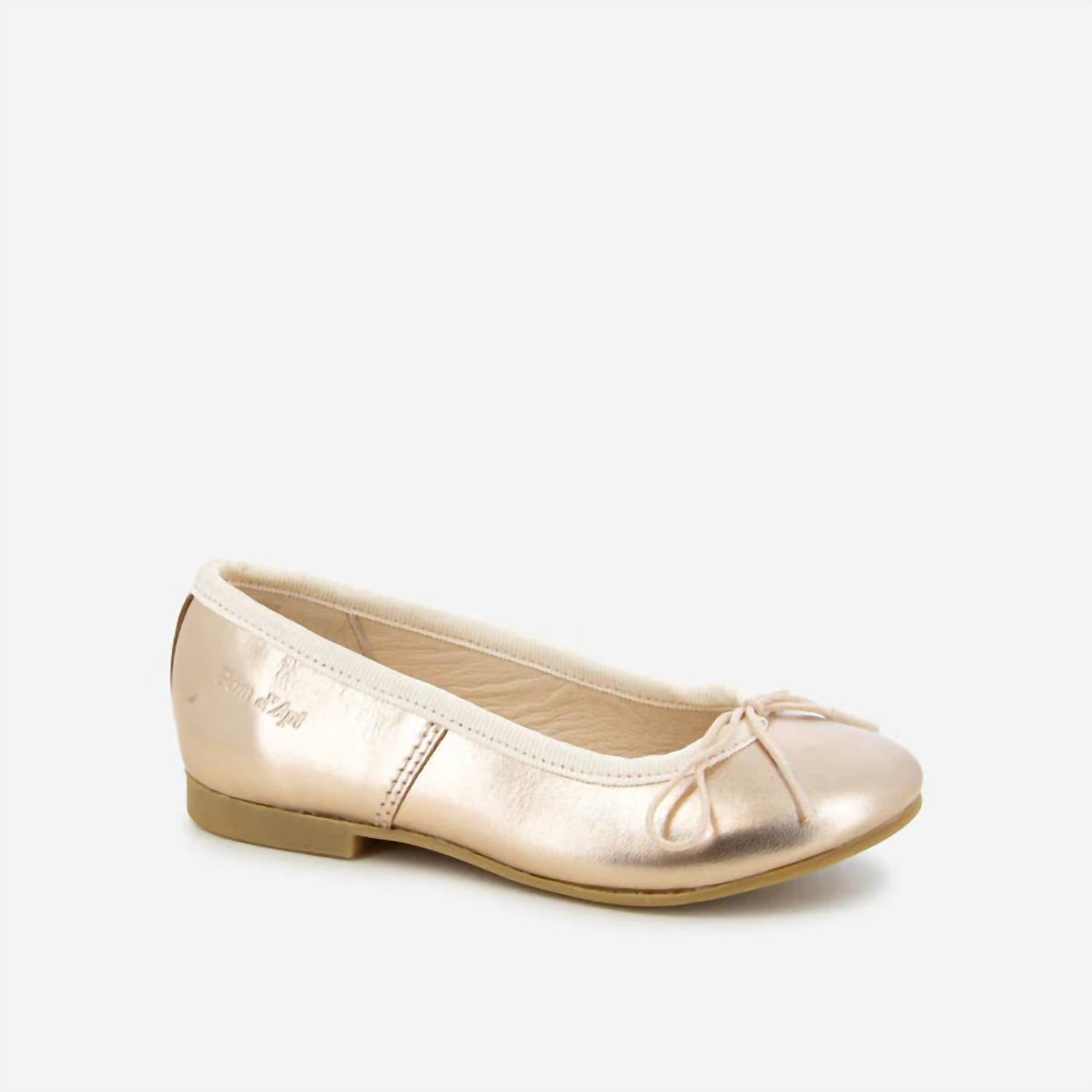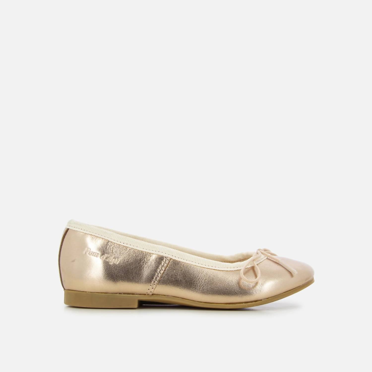 Introducing the Girl's Dory Bal Laminato by Pom d'Api, a delightful option for little fashionistas. This ballerina shoe shines in a light bronze with a metallic effect, perfect for adding a touch of glamour to any outfit. Crafted with a leather upper, leather lining, and a leather insole with a rubber sole, this shoe is built for flexibility and comfort to support healthy foot development. Made in Tunisia, the round toe shape completes the elegant look, ensuring style and functionality for your child.