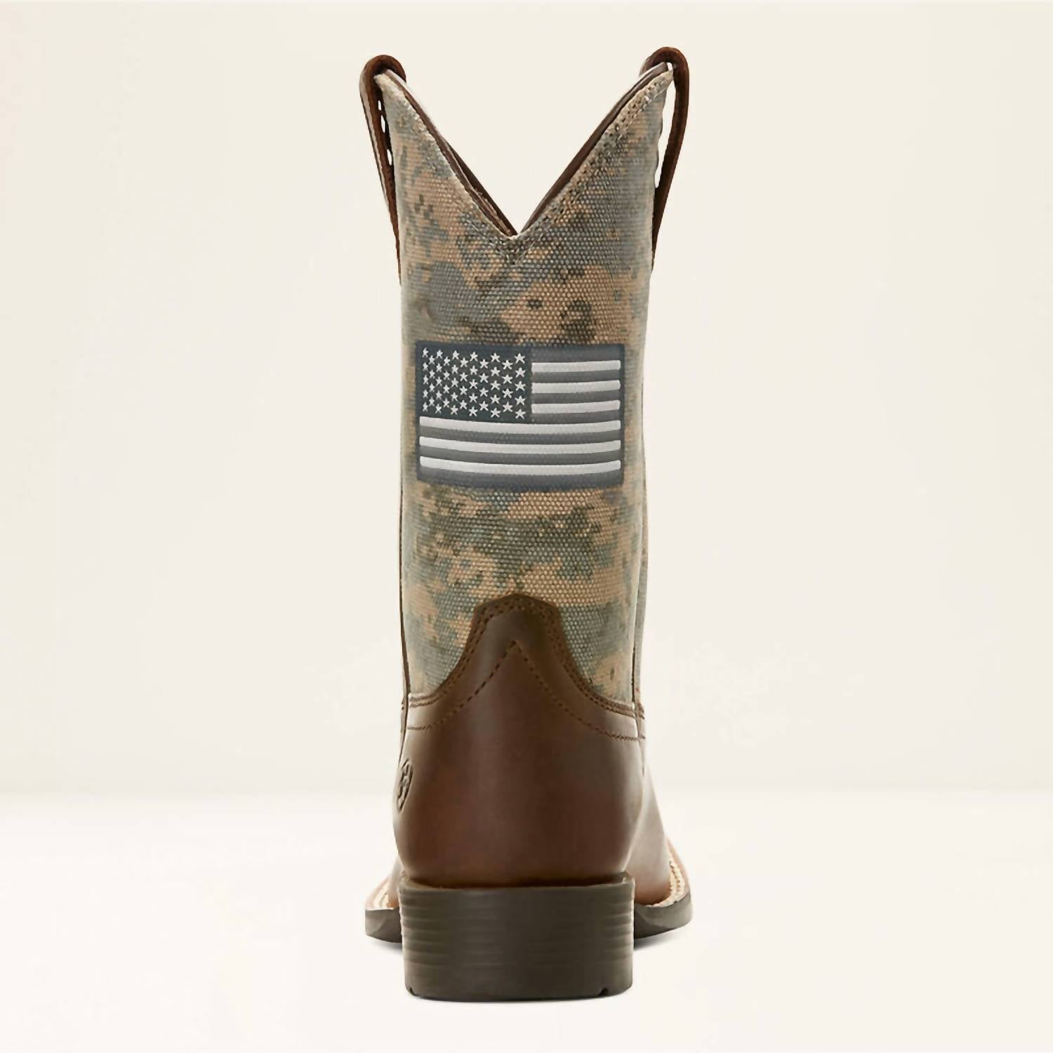 Elevate your young one's style with the Kid's Patriot Western Boot by ARIAT, showcasing a distinctive distressed brown and sage camo design. These boots feature an 8.5-inch shaft and a 1.125-inch heel for a classic western silhouette. Crafted with a full-grain leather foot, they offer both durability and flexibility, complemented by a lightweight sole for long-lasting wear. The innovative 4LRâ„¢ technology ensures lightweight support, while the removable Wiggle Roomâ„¢ insole accommodates growing feet.